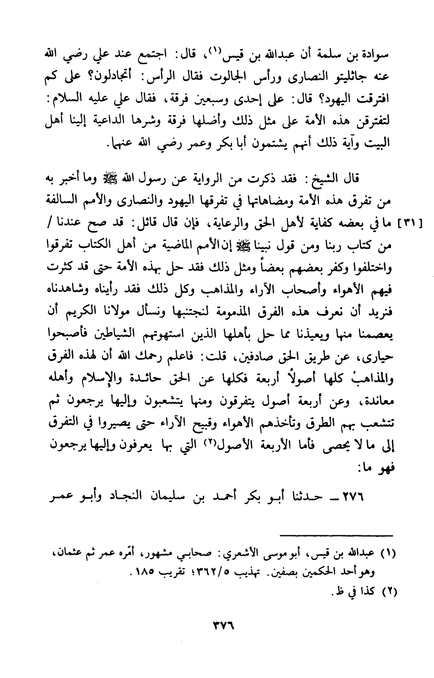 276 - حَدَّثَنَا أَبُو بَكْرٍ أَحْمَدُ بْنُ سُلَيْمَانَ النَّجَّادُ، وَأَبُو عُمَرَ -[377]- عُبَيْدُ اللَّهِ بْنُ مُحَمَّدِ بْنِ عُبَيْدِ بْنِ مُسَبِّحٍ الْعَطَّارُ، وَأَبُو بَكْرٍ مُحَمَّدُ بْنُ الْحُسَيْنِ، وَأَبُو يُوسُفَ يَعْقُوبُ بْنُ يُوسُفَ، قَالُوا: حَدَّثَنَا أَبُو بَكْرٍ عَبْدُ اللَّهِ بْنُ سُلَيْمَانَ بْنِ الْأَشْعَثِ السِّجِسْتَانِيُّ، قَالَ: حَدَّثَنَا الْمُسَيَّبُ بْنُ وَاضِحٍ، قَالَ: سَمِعْتُ يُوسُفَ بْنَ أَسْبَاطٍ يَقُولُ: " §أَصْلُ الْبِدَعِ أَرْبَعَةٌ: الرَّوَافِضُ، وَالْخَوَارِجُ، وَالْقَدَرِيَّةُ، وَالْمُرْجِئَةُ، ثُمَّ تَتَشَعَّبُ كُلُّ فِرْقَةٍ ثَمَانِيَ عَشْرَةَ طَائِفَةً، فَتِلْكَ اثْنَتَانِ وَسَبْعُونَ فِرْقَةً، وَالثَّالِثُ وَالسَّبْعُونَ الْجَمَاعَةُ الَّتِي قَالَ رَسُولُ اللَّهِ صَلَّى اللَّهُ عَلَيْهِ وَسَلَّمَ: «إِنَّهَا النَّاجِيَةُ»