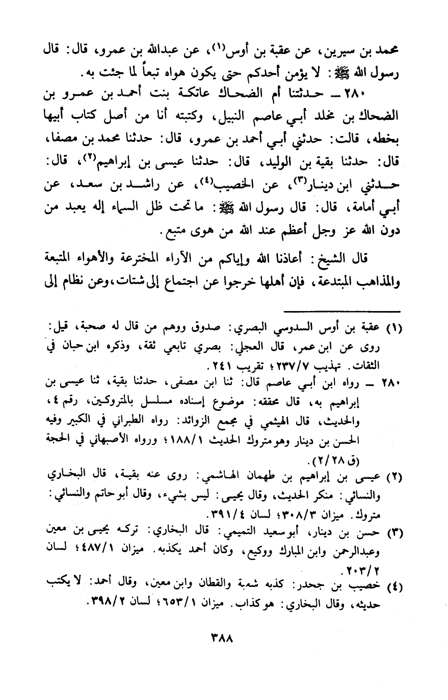 280 - حَدَّثَتْنَا أُمُّ الضَّحَّاكِ عَاتِكَةُ بِنْتُ أَحْمَدَ بْنِ عَمْرِو بْنِ الضَّحَّاكِ بْنِ مَخْلَدٍ أَبِي عَاصِمٍ النَّبِيلِ، وَكَتَبْتُهُ أَنَا مِنْ أَصْلِ كِتَابِ أَبِيهَا بِخَطِّهِ، قَالَتْ: حَدَّثَنِي أَبِي أَحْمَدُ بْنُ عَمْرٍو، قَالَ: حَدَّثَنَا مُحَمَّدُ بْنُ مُصَفًّى، قَالَ: حَدَّثَنَا بَقِيَّةُ بْنُ الْوَلِيدِ، قَالَ: حَدَّثَنَا عِيسَى بْنُ إِبْرَاهِيمَ، قَالَ: حَدَّثَنِي ابْنُ دِينَارٍ، عَنِ الْخَصِيبِ، عَنْ رَاشِدِ بْنِ سَعْدٍ، عَنْ أَبِي أُمَامَةَ، قَالَ: قَالَ رَسُولُ اللَّهِ صَلَّى اللَّهُ عَلَيْهِ وَسَلَّمَ: § «مَا تَحْتَ ظِلِّ السَّمَاءِ إِلَهٌ يُعْبَدُ مِنْ دُونِ اللَّهِ عَزَّ وَجَلَّ أَعْظَمُ عِنْدَ اللَّهِ مِنْ هَوًى مُتَّبَعٍ» قَالَ الشَّيْخُ: «أَعَاذَنَا اللَّهُ وَإِيَّاكُمْ مِنَ الْآرَاءِ الْمُخْتَرِعَةِ، وَالْأَهْوَاءِ الْمُتَّبِعَةِ، وَالْمَذَاهِبِ الْمُبْتَدِعَةِ، فَإِنَّ أَهْلَهَا خَرَجُوا عَنِ اجْتِمَاعٍ إِلَى شَتَاتٍ، وَعَنْ نِظَامٍ إِلَى -[389]- تَفَرُّقٍ، وَعَنْ أُنْسٍ إِلَى وَحْشَةٍ، وَعَنِ ائْتِلَافٍ إِلَى اخْتِلَافٍ، وَعَنْ مَحَبَّةٍ إِلَى بُغْضَةٍ، وَعَنْ نَصِيحَةٍ وَمُوَالَاةٍ إِلَى غِشٍّ وَمُعَادَاةٍ، وَعَصَمَنَا وَإِيَّاكُمْ مِنَ الِانْتِمَاءِ إِلَى كُلِّ اسْمٍ خَالَفَ الْإِسْلَامَ وَالسُّنَّةَ»