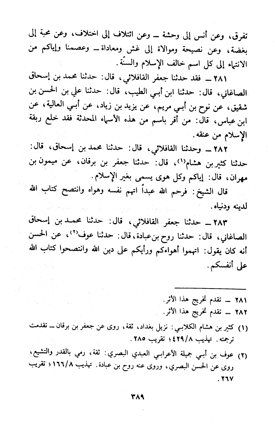 283 - حَدَّثَنَا جَعْفَرٌ الْقَافْلَائِيُّ، قَالَ: حَدَّثَنَا مُحَمَّدُ بْنُ إِسْحَاقَ الصَّاغَانِيُّ، قَالَ: حَدَّثَنَا رَوْحُ بْنُ عُبَادَةَ، قَالَ: حَدَّثَنَا عَوْفٌ، عَنِ الْحَسَنِ، أَنَّهُ كَانَ يَقُولُ: «§اتَّهِمُوا أَهْوَاءَكُمْ وَرَأْيَكُمْ عَلَى دِينِ اللَّهِ، وَانْتَصِحُوا كِتَابَ اللَّهِ عَلَى أَنْفُسِكُمْ»