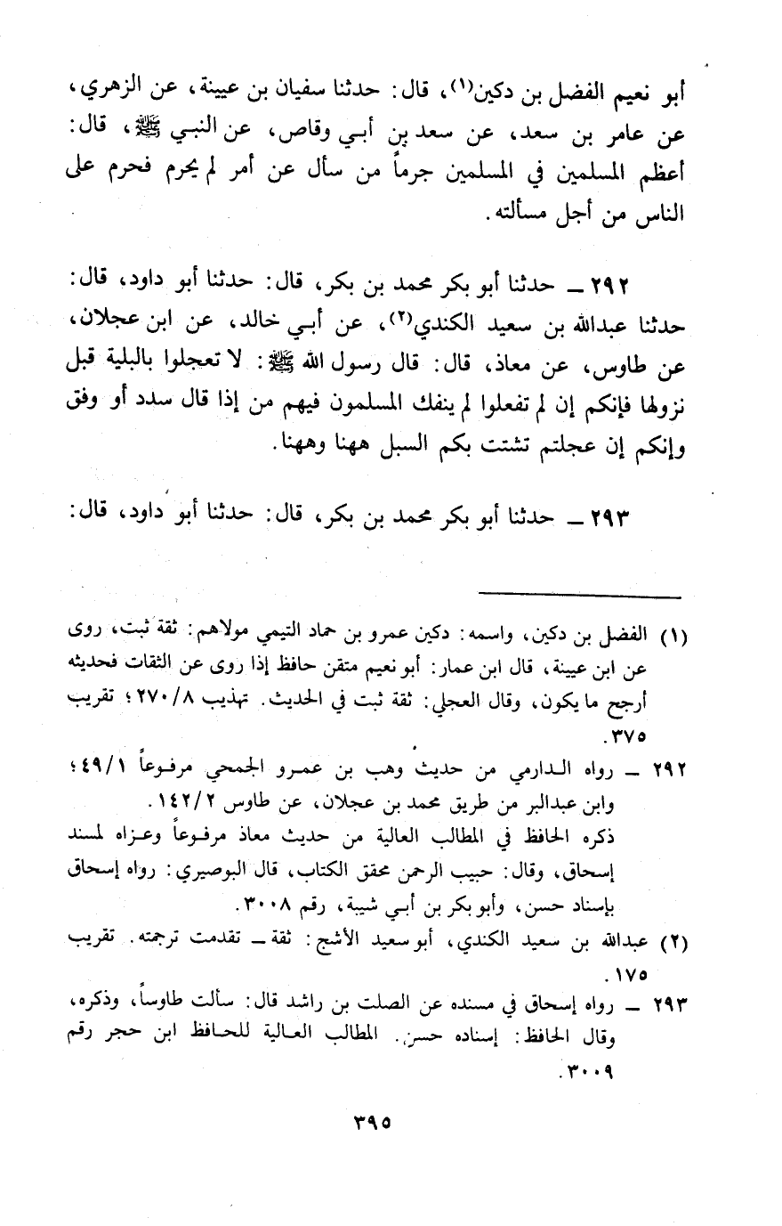 293 - حَدَّثَنَا أَبُو بَكْرٍ مُحَمَّدُ بْنُ بَكْرٍ، قَالَ: حَدَّثَنَا أَبُو دَاوُدَ، قَالَ: -[396]- حَدَّثَنَا مُحَمَّدُ بْنُ عُبَيْدٍ، قَالَ: حَدَّثَنَا حَمَّادُ بْنُ زَيْدٍ، وَحَدَّثَنَا أَبُو عَلِيٍّ مُحَمَّدُ بْنُ أَحْمَدَ بْنِ إِسْحَاقَ الْبَزَّازُ، قَالَ: حَدَّثَنَا بِشْرُ بْنُ مُوسَى، - وَهَذَا لَفْظُهُ - قَالَ: حَدَّثَنَا سَعِيدُ بْنُ مَنْصُورٍ، قَالَ: حَدَّثَنَا حَمَّادُ بْنُ زَيْدٍ، عَنِ الصَّلْتِ بْنِ رَاشِدٍ، قَالَ: سَأَلْتُ طَاوُسًا عَنْ مَسْأَلَةٍ فَقَالَ لِي أَكَانَتْ؟ قُلْتُ: نَعَمْ، قَالَ: آللَّهِ، قُلْتُ: آللَّهِ، قَالَ: إِنَّ أَصْحَابَنَا أَخْبَرُونَا عَنْ مُعَاذِ بْنِ جَبَلٍ أَنَّهُ قَالَ: «أَيُّهَا النَّاسُ §لَا تَسْأَلُوا عَنِ الْبَلَاءِ قَبْلَ نُزُولِهِ، فَيَذْهَبَ بِكُمْ هَاهُنَا وَهَاهُنَا، وَإِنَّكُمْ إِنْ لَمْ تَسْأَلُوا لَمْ تُبْتَلَوْا، فَإِنَّهُ لَا يَنْفَكُّ أَنْ يَكُونَ فِي الْمُسْلِمِينَ مَنْ إِذَا قَالَ وُفِّقَ، أَوْ قَالَ سُدِّدَ»