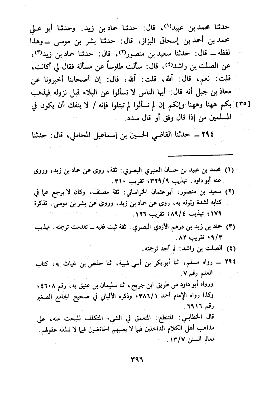 294 - حَدَّثَنَا الْقَاضِي الْحُسَيْنُ بْنُ إِسْمَاعِيلَ الْمَحَامِلِيُّ، قَالَ: حَدَّثَنَا -[397]- أَبُو هِشَامٍ الرِّفَاعِيُّ، قَالَ: حَدَّثَنَا حَفْصُ بْنُ غِيَاثٍ، عَنِ ابْنِ جُرَيْجٍ، قَالَ الْقَاضِي: وَحَدَّثَنَا يَعْقُوبُ الدَّوْرَقِيُّ، قَالَ: حَدَّثَنَا يَحْيَى بْنُ سَعِيدٍ، عَنِ ابْنِ جُرَيْجٍ، عَنْ سُلَيْمَانَ بْنِ عَتِيقٍ، عَنْ طَلْقِ بْنِ حَبِيبٍ، عَنِ الْأَحْنَفِ بْنِ قَيْسٍ، عَنِ ابْنِ مَسْعُودٍ، عَنِ النَّبِيِّ صَلَّى اللَّهُ عَلَيْهِ وَسَلَّمَ قَالَ: § «هَلَكَ الْمُتَنَطِّعُونَ» ثَلَاثَ مَرَّاتٍ