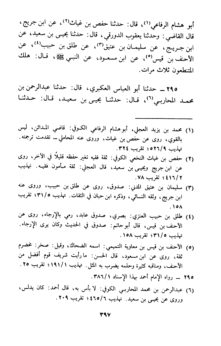 295 - حَدَّثَنَا أَبُو الْعَبَّاسِ الْعُكْبَرِيُّ، قَالَ: حَدَّثَنَا عَبْدُ الرَّحْمَنِ بْنُ مُحَمَّدٍ الْمُحَارِبِيُّ، قَالَ: حَدَّثَنَا يَحْيَى بْنُ سَعِيدٍ، قَالَ: حَدَّثَنَا -[398]- ابْنُ جُرَيْجٍ، عَنْ سُلَيْمَانَ بْنِ عَتِيقٍ، عَنْ طَلْقِ بْنِ حَبِيبٍ، عَنِ الْأَحْنَفِ بْنِ قَيْسٍ، عَنْ عَبْدِ اللَّهِ بْنِ مَسْعُودٍ، قَالَ: قَالَ رَسُولُ اللَّهِ صَلَّى اللَّهُ عَلَيْهِ وَسَلَّمَ: § «أَلَا هَلَكَ الْمُتَنَطِّعُونَ» قَالَهَا ثَلَاثًا