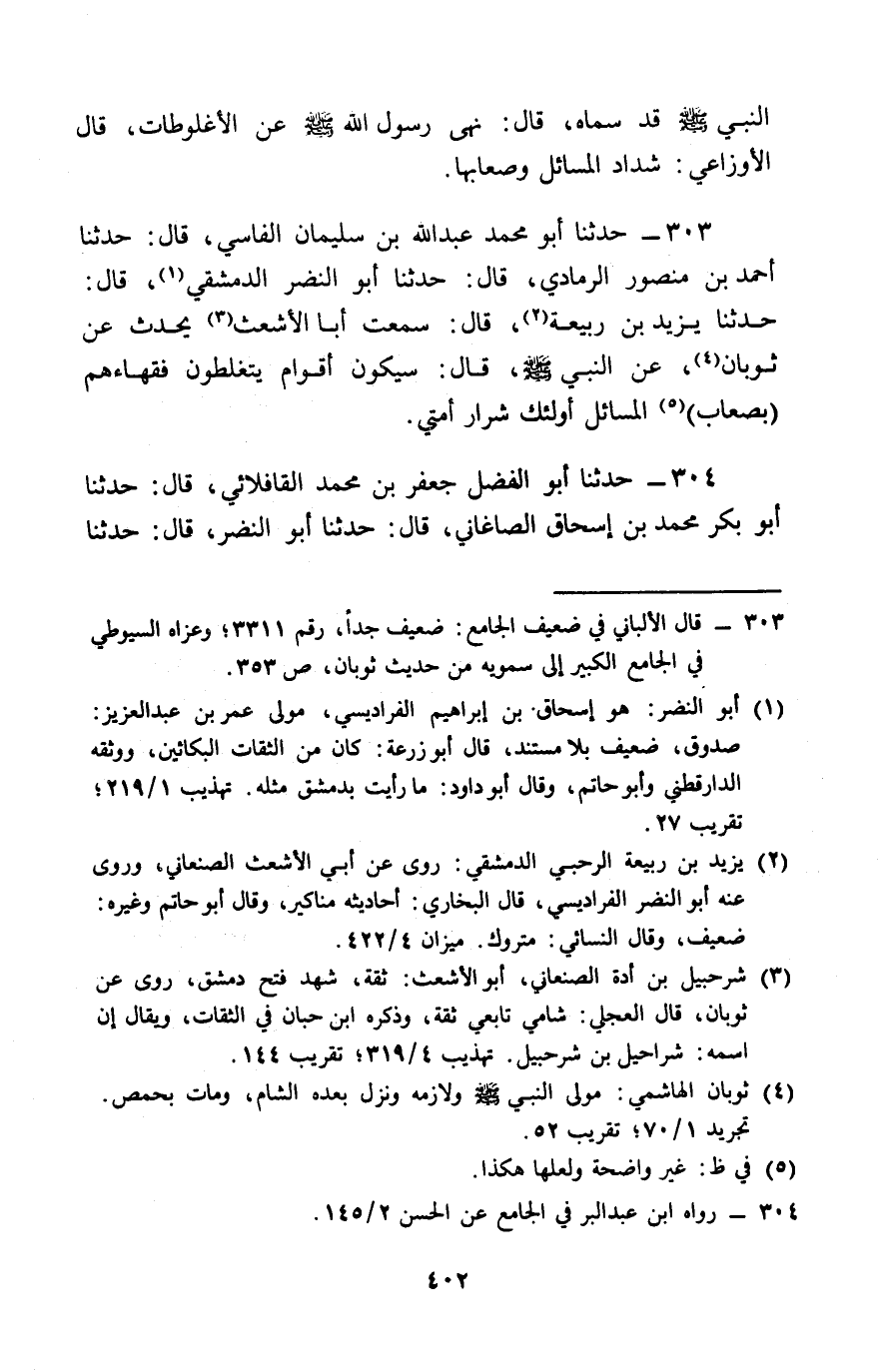 303 - حَدَّثَنَا أَبُو مُحَمَّدٍ عَبْدُ اللَّهِ بْنُ سُلَيْمَانَ الْفَاسِيُّ، قَالَ: حَدَّثَنَا أَحْمَدُ بْنُ مَنْصُورٍ الرَّمَادِيُّ، قَالَ: حَدَّثَنَا أَبُو النَّضْرِ الدِّمَشْقِيُّ، قَالَ: حَدَّثَنَا يَزِيدُ بْنُ رَبِيعَةَ، قَالَ: سَمِعْتُ أَبَا الْأَشْعَثِ، يُحَدِّثُ، عَنْ ثَوْبَانَ، عَنِ النَّبِيِّ صَلَّى اللَّهُ عَلَيْهِ وَسَلَّمَ قَالَ: § «سَيَكُونُ أَقْوَامٌ يَتَغَلَّطُونَ فُقَهَاءَهُمْ بِصِعَابِ الْمَسَائِلِ أُولَئِكَ شِرَارُ أُمَّتِي»
