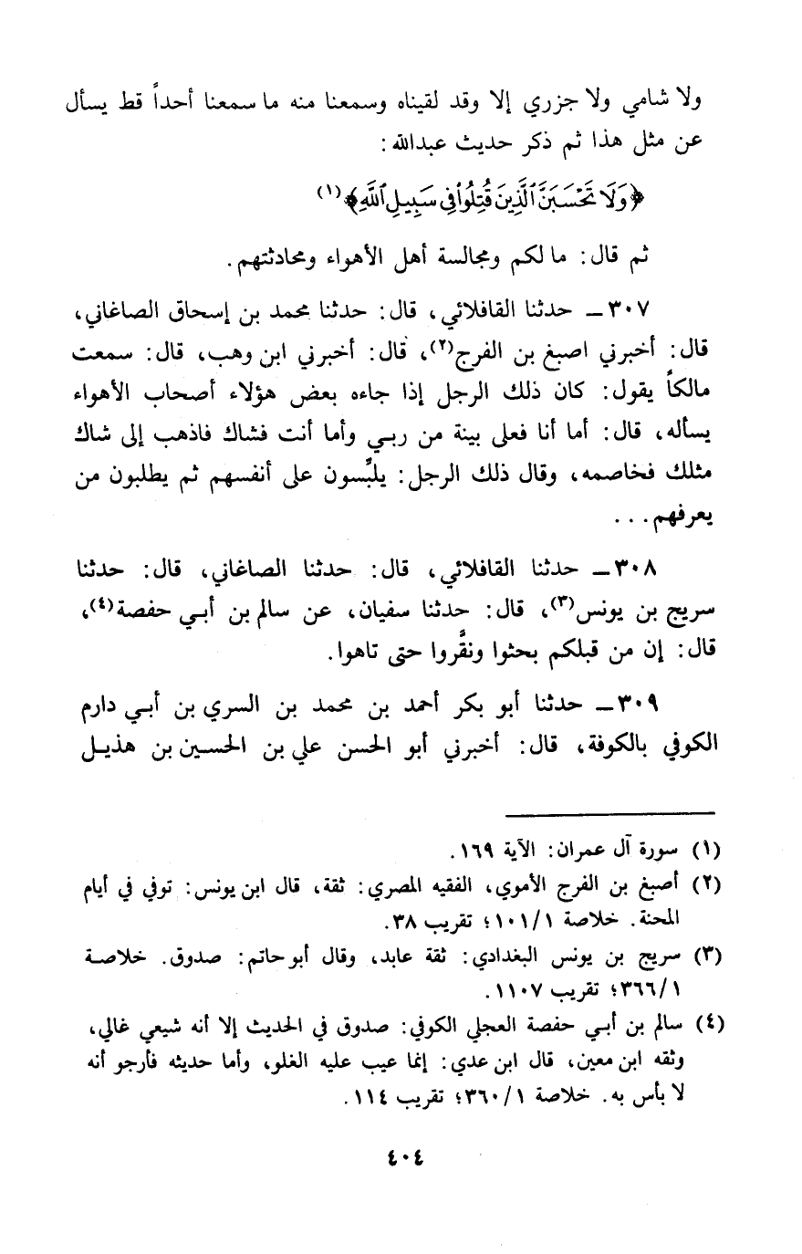 306 - ثُمَّ ذَكَرَ حَدِيثَ عَبْدِ اللَّهِ: {§وَلَا تَحْسَبَنَّ الَّذِينَ قُتِلُوا فِي سَبِيلِ اللَّهِ} [آل عمران: 169]، ثُمَّ قَالَ: «مَا لَكُمْ وَمُجَالَسَةَ أَهْلِ الْأَهْوَاءِ، وَمُحَادَثَتَهُمْ»