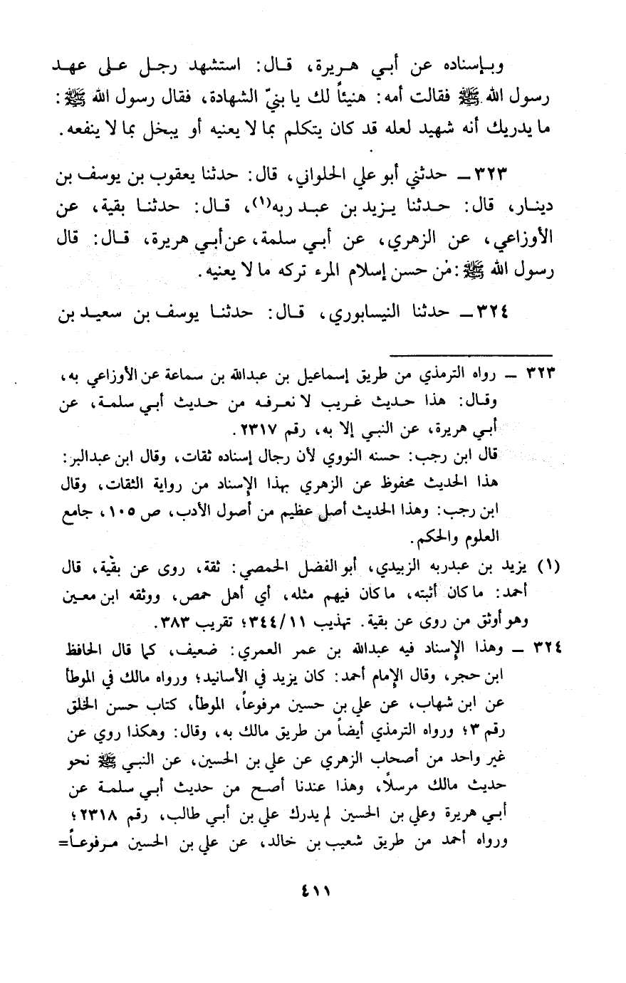 323 - حَدَّثَنِي أَبُو عَلِيٍّ الْحُلْوَانِيُّ، قَالَ: حَدَّثَنَا يَعْقُوبُ بْنُ يُوسُفَ بْنِ دِينَارٍ، قَالَ: حَدَّثَنَا يَزِيدُ بْنُ عَبْدِ رَبِّهِ، قَالَ: حَدَّثَنَا بَقِيَّةُ، عَنِ الْأَوْزَاعِيِّ، عَنِ الزُّهْرِيِّ، عَنْ أَبِي سَلَمَةَ، عَنْ أَبِي هُرَيْرَةَ، قَالَ: قَالَ رَسُولُ اللَّهِ صَلَّى اللَّهُ عَلَيْهِ وَسَلَّمَ: § «مِنْ حُسْنِ إِسْلَامِ الْمَرْءِ تَرْكُهُ مَا لَا يَعْنِيهِ»