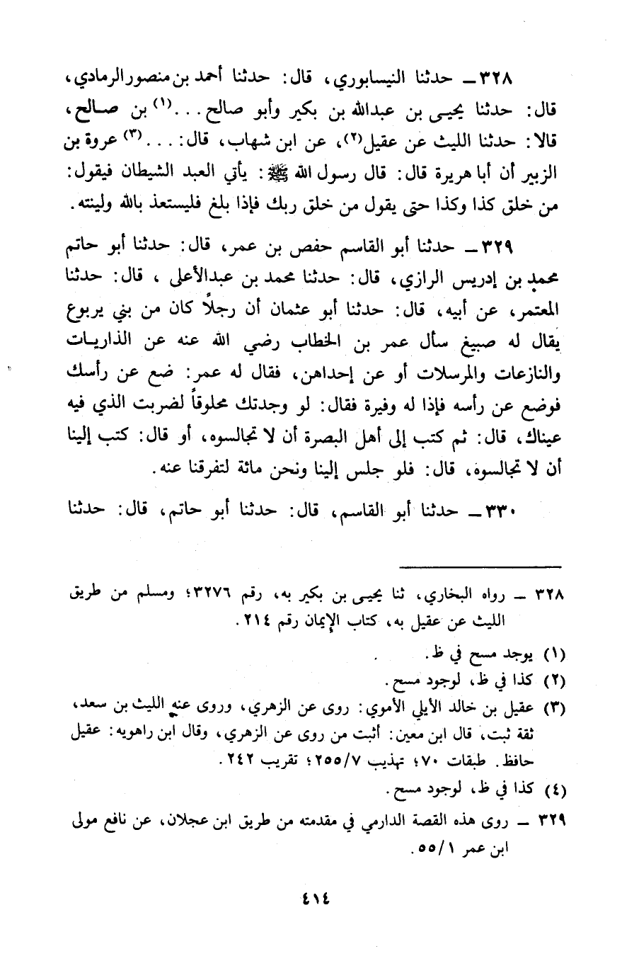 328 - حَدَّثَنَا النَّيْسَابُورِيُّ، قَالَ: حَدَّثَنَا أَحْمَدُ بْنُ مَنْصُورٍ الرَّمَادِيُّ، قَالَ: حَدَّثَنَا يَحْيَى بْنُ عَبْدِ اللَّهِ بْنِ بُكَيْرٍ، وَأَبُو صَالِحٍ. . . بْنُ صَالِحٍ، قَالَا: حَدَّثَنَا اللَّيْثُ، عَنْ عُقَيْلٍ، عَنِ ابْنِ شِهَابٍ، قَالَ: عُرْوَةُ بْنُ الزُّبَيْرِ، أَنَّ أَبَا هُرَيْرَةَ، قَالَ: قَالَ رَسُولُ اللَّهِ صَلَّى اللَّهُ عَلَيْهِ وَسَلَّمَ: " §يَأْتِي الْعَبْدَ الشَّيْطَانُ، فَيَقُولُ: مَنْ خَلَقَ كَذَا وَكَذَا؟ حَتَّى يَقُولَ: مَنْ خَلَقَ رَبَّكَ؟ فَإِذَا بَلَغَ فَلْيَسْتَعِذْ بِاللَّهِ، وَلْيَنْتَهِ "