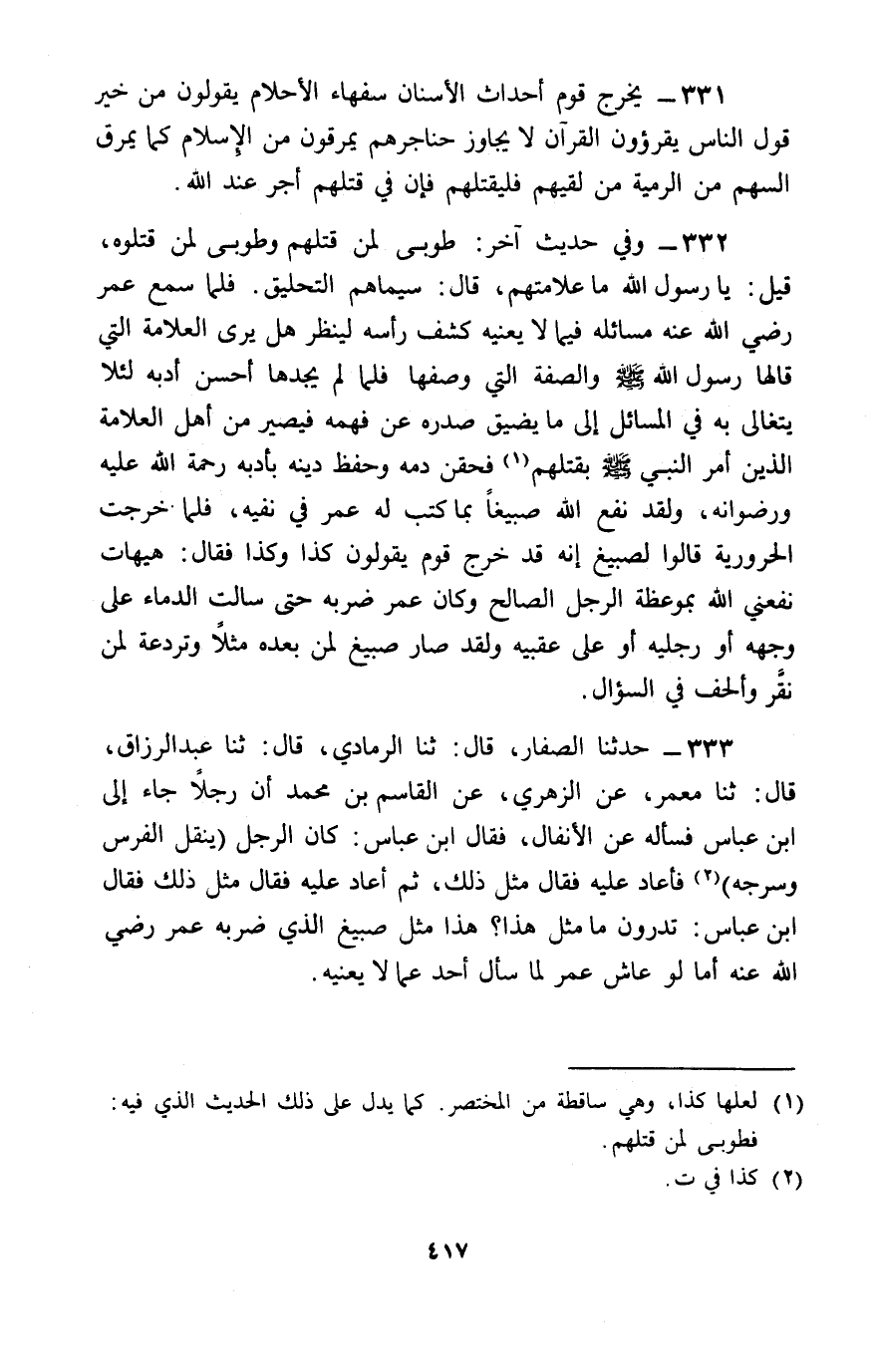 332 - وَفِي حَدِيثٍ آخَرَ: «§طُوبَى لِمَنْ قَتَلَهُمْ، وَطُوبَى لِمَنْ قَتَلُوهُ» قِيلَ: يَا رَسُولَ اللَّهِ مَا عَلَامَتُهُمْ؟ قَالَ: «سِيمَاهُمُ التَّحْلِيقُ». فَلَمَّا سَمِعَ عُمَرُ رَضِيَ اللَّهُ عَنْهُ مَسَائِلَهُ فِيمَا لَا يَعْنِيهِ كَشَفَ رَأْسَهُ، لِيَنْظُرَ هَلْ يَرَى الْعَلَامَةَ الَّتِي قَالَهَا رَسُولُ اللَّهِ صَلَّى اللَّهُ عَلَيْهِ وَسَلَّمَ وَالصِّفَةَ الَّتِي وَصَفَهَا، فَلَمَّا لَمْ يَجِدْهَا، أَحْسَنَ أَدَبَهُ، لِئَلَّا يَتَغَالَى بِهِ فِي الْمَسَائِلِ إِلَى مَا يَضِيقُ صَدْرُهُ عَنْ فَهْمِهِ، فَيَصِيرَ مِنْ أَهْلِ الْعَلَامَةِ الَّذِينَ أَمَرَ النَّبِيُّ صَلَّى اللَّهُ عَلَيْهِ وَسَلَّمَ بِقَتْلِهِمْ، فَحَقَنَ دَمَهُ، وَحَفِظَ دِينَهُ بِأَدَبِهِ رَحْمَةُ اللَّهِ عَلَيْهِ وَرِضْوَانُهُ، وَلَقَدْ نَفَعَ اللَّهُ صَبِيغًا بِمَا كَتَبَ لَهُ عُمَرُ فِي نَفْيِهِ، فَلَمَّا خَرَجَتِ الْحَرُورِيَّةُ، قَالُوا لِصَبِيغٍ: إِنَّهُ قَدْ خَرَجَ قَوْمٌ يَقُولُونَ كَذَا وَكَذَا، فَقَالَ: هَيْهَاتَ، نَفَعَنِي اللَّهُ بِمَوْعِظَةِ الرَّجُلِ الصَّالِحِ، وَكَانَ عُمَرُ ضَرَبَهُ حَتَّى سَالَتِ الدِّمَاءُ عَلَى وَجْهِهِ أَوْ رِجْلَيْهِ أَوْ عَلَى عَقِبَيْهِ، وَلَقَدْ صَارَ صَبِيغٌ لِمَنْ بَعْدَهُ مَثَلًا، وَتَرْدِعَةً لِمَنْ نَقَّرَ، وَأَلْحَفَ فِي السُّؤَالِ