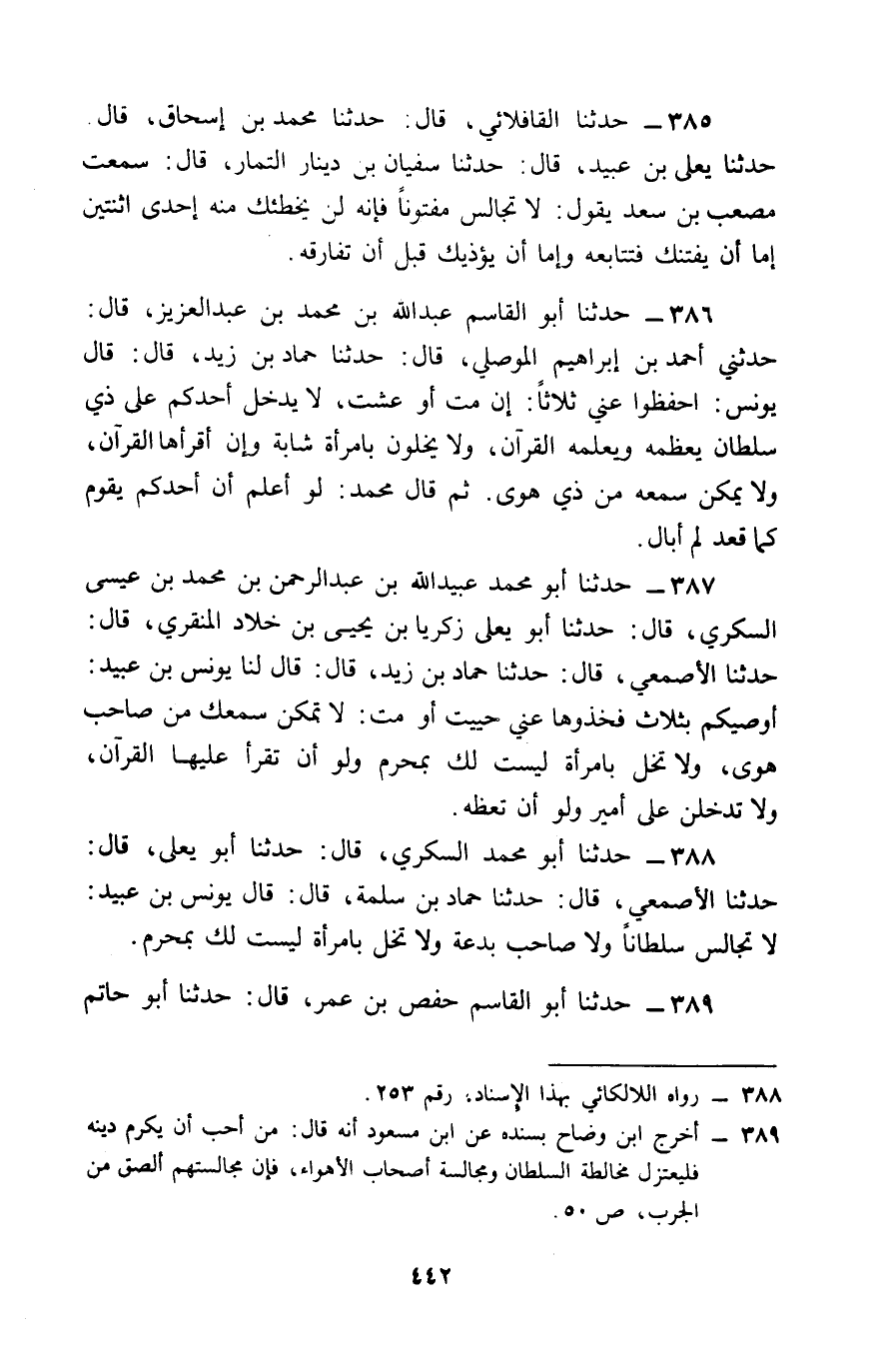 387 - حَدَّثَنَا أَبُو مُحَمَّدٍ عُبَيْدُ اللَّهِ بْنُ عَبْدِ الرَّحْمَنِ بْنِ مُحَمَّدِ بْنِ عِيسَى السُّكَّرِيُّ قَالَ: حَدَّثَنَا أَبُو يَعْلَى زَكَرِيَّا بْنُ يَحْيَى بْنِ خَلَّادٍ الْمِنْقَرِيُّ قَالَ: حَدَّثَنَا الْأَصْمَعِيُّ , قَالَ: حَدَّثَنَا حَمَّادُ بْنُ زَيْدٍ , قَالَ: قَالَ لَنَا يُونُسُ بْنُ عُبَيْدٍ: أُوصِيكُمْ بِثَلَاثٍ , فَخُذُوهَا عَنِّي حَيِيتُ أَوْ مُتُّ: لَا تُمَكِّنْ سَمْعَكَ مِنْ صَاحِبِ هَوًى , وَلَا تَخْلُ بِامْرَأَةٍ لَيْسَتْ لَكَ بِمَحْرِمٍ , وَلَوْ أَنْ تَقْرَأَ عَلَيْهَا الْقُرْآنَ , §وَلَا تَدْخُلَنَّ عَلَى أَمِيرٍ , وَلَوْ أَنْ تَعِظَهُ
