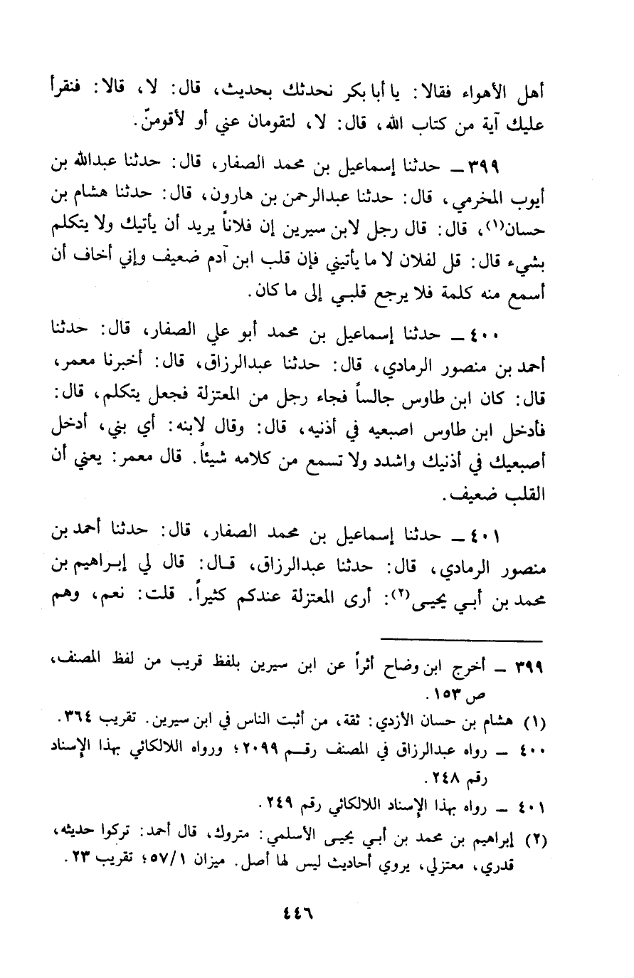 401 - حَدَّثَنَا إِسْمَاعِيلُ بْنُ مُحَمَّدٍ الصَّفَّارُ , قَالَ: حَدَّثَنَا أَحْمَدُ بْنُ مَنْصُورٍ الرَّمَادِيُّ , قَالَ: حَدَّثَنَا عَبْدُ الرَّزَّاقِ , قَالَ: قَالَ لِي إِبْرَاهِيمُ بْنُ مُحَمَّدِ بْنِ أَبِي يَحْيَى: أَرَى الْمُعْتَزِلَةَ عِنْدَكُمْ كَثِيرًا , قُلْتُ: نَعَمْ , وَهُمْ -[447]- يَزْعُمُونَ أَنَّكَ مِنْهُمْ , قَالَ: أَفَلَا تَدْخُلُ مَعِي هَذَا الْحَانُوتَ حَتَّى أُكَلِّمَكَ , قُلْتُ: لَا قَالَ: لِمَ؟ قُلْتُ: §لِأَنَّ الْقَلْبَ ضَعِيفٌ , وَالدِّينُ لَيْسَ لِمَنْ غُلِبَ