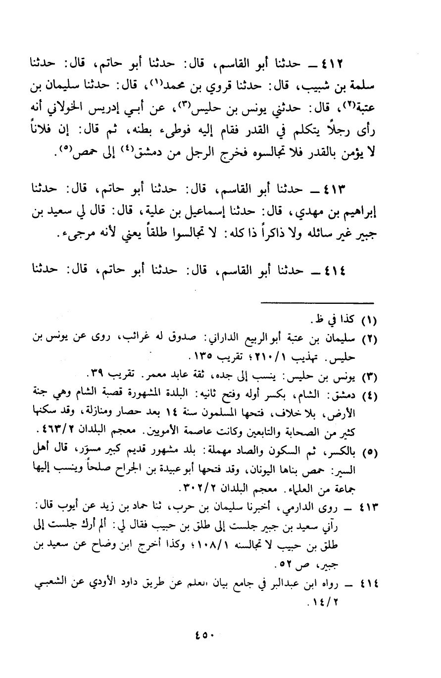 412 - حَدَّثَنَا أَبُو الْقَاسِمِ , قَالَ: حَدَّثَنَا أَبُو حَاتِمٍ , قَالَ: حَدَّثَنَا سَلَمَةُ بْنُ شَبِيبٍ , قَالَ: حَدَّثَنَا قَرَوِيُّ بْنُ مُحَمَّدٍ , قَالَ: حَدَّثَنَا سُلَيْمَانُ بْنُ عُتْبَةَ , قَالَ: حَدَّثَنِي يُونُسُ بْنُ حَلْبَسٍ , عَنْ أَبِي إِدْرِيسَ الْخَوْلَانِيِّ , أَنَّهُ §رَأَى رَجُلًا يَتَكَلَّمُ فِي الْقَدَرِ , فَقَامَ إِلَيْهِ فَوَطِئَ بَطْنَهُ , ثُمَّ قَالَ: إِنَّ فُلَانًا لَا يُؤْمِنُ بِالْقَدَرِ , فَلَا تُجَالِسُوهُ , فَخَرَجَ الرَّجُلُ مِنْ دِمَشْقَ إِلَى حِمْصَ