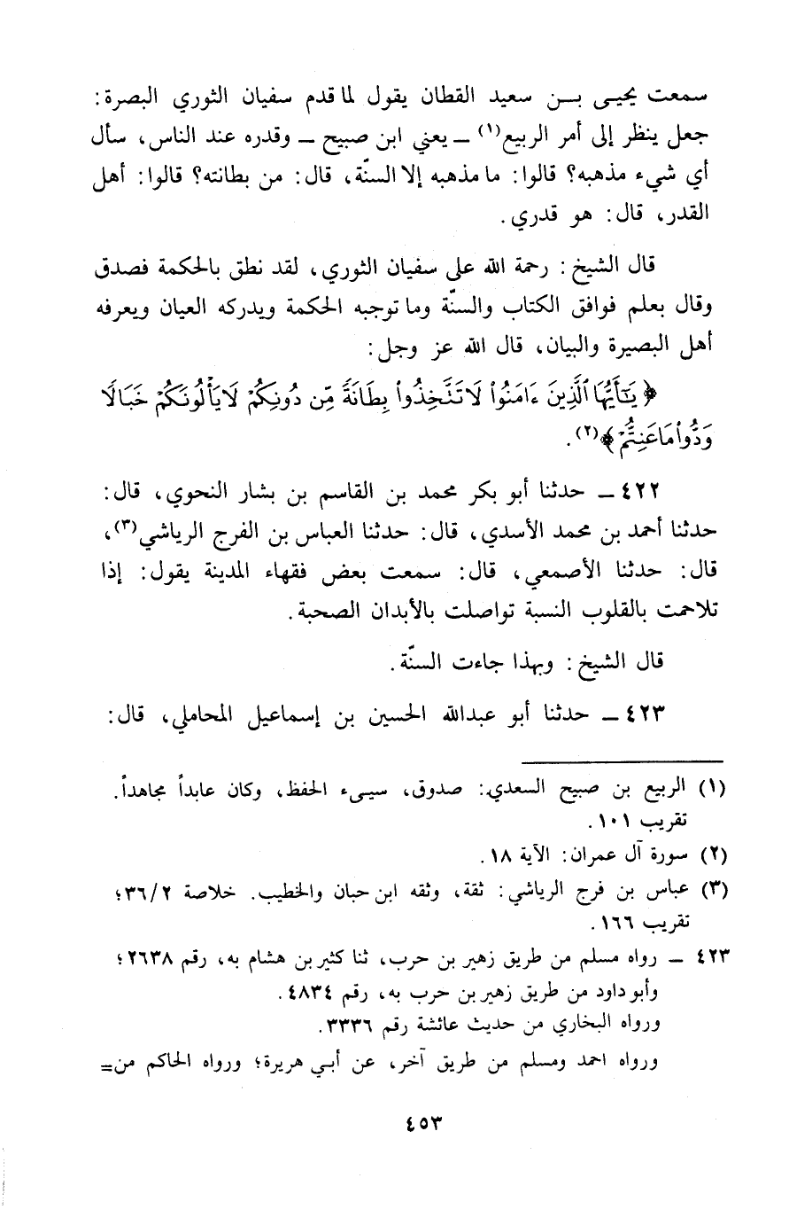 422 - حَدَّثَنَا أَبُو بَكْرٍ مُحَمَّدُ بْنُ الْقَاسِمِ بْنِ بَشَّارٍ النَّحْوِيُّ قَالَ: حَدَّثَنَا أَحْمَدُ بْنُ مُحَمَّدٍ الْأَسَدِيُّ , قَالَ: حَدَّثَنَا الْعَبَّاسُ بْنُ الْفَرَجِ الرِّيَاشِيُّ , قَالَ: حَدَّثَنَا الْأَصْمَعِيُّ , قَالَ: سَمِعْتُ بَعْضَ فُقَهَاءِ الْمَدِينَةِ يَقُولُ: §إِذَا تَلَاحَمَتْ بِالْقُلُوبِ النِّسْبَةُ تَوَاصَلَتْ بِالْأَبْدَانِ الصُّحْبَةُ. قَالَ الشَّيْخُ: وَبِهَذَا جَاءَتِ السُّنَّةُ
