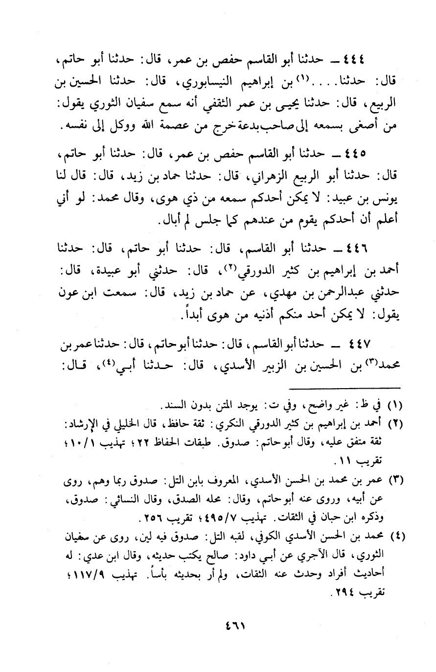 445 - حَدَّثَنَا أَبُو الْقَاسِمِ حَفْصُ بْنُ عُمَرَ قَالَ: حَدَّثَنَا أَبُو حَاتِمٍ , قَالَ: حَدَّثَنَا أَبُو الرَّبِيعِ الزَّهْرَانِيُّ , قَالَ: حَدَّثَنَا حَمَّادُ بْنُ زَيْدٍ , قَالَ: قَالَ لَنَا يُونُسُ بْنُ عُبَيْدٍ: §لَا يُمَكِّنْ أَحَدُكُمْ سَمْعَهُ مِنْ ذِي هَوًى , وَقَالَ مُحَمَّدٌ: لَوْ أَنِّي أَعْلَمُ أَنَّ أَحَدَكُمْ يَقُومُ مِنْ عِنْدِهِمْ كَمَا جَلَسَ لَمْ أُبَالِ