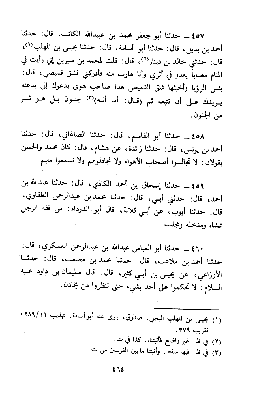 457 - حَدَّثَنَا أَبُو جَعْفَرٍ مُحَمَّدُ بْنُ عُبَيْدِ اللَّهِ الْكَاتِبُ قَالَ: حَدَّثَنَا أَحْمَدُ بْنُ بُدَيْلٍ , قَالَ: حَدَّثَنَا أَبُو أُسَامَةَ , قَالَ: حَدَّثَنَا يَحْيَى بْنُ الْمُهَلَّبِ , قَالَ: حَدَّثَنِي خَالِدُ بْنُ دِينَارٍ , قَالَ: قُلْتُ لِمُحَمَّدِ بْنِ سِيرِينَ: إِنِّي رَأَيْتُ فِيَ الْمَنَامِ مُصَابًا يَعْدُو فِي أَثَرِي , وَأَنَا هَارِبٌ مِنْهُ , فَأَدْرَكَنِي , فَشَقَّ قَمِيصِي قَالَ: بِئْسَ الرُّؤْيَا , وَأَخْبَثُهَا , شَقُّ الْقَمِيصِ هَذَا §صَاحِبُ هَوًى يَدْعُوكَ إِلَى بِدْعَتِهِ يُرِيدُكَ عَلَى أَنْ تَتْبَعَهُ , ثُمَّ قَالَ: أَمَا أَنَّهُ جُنُونٌ , بَلْ هُوَ شَرٌّ مِنَ الْجُنُونِ