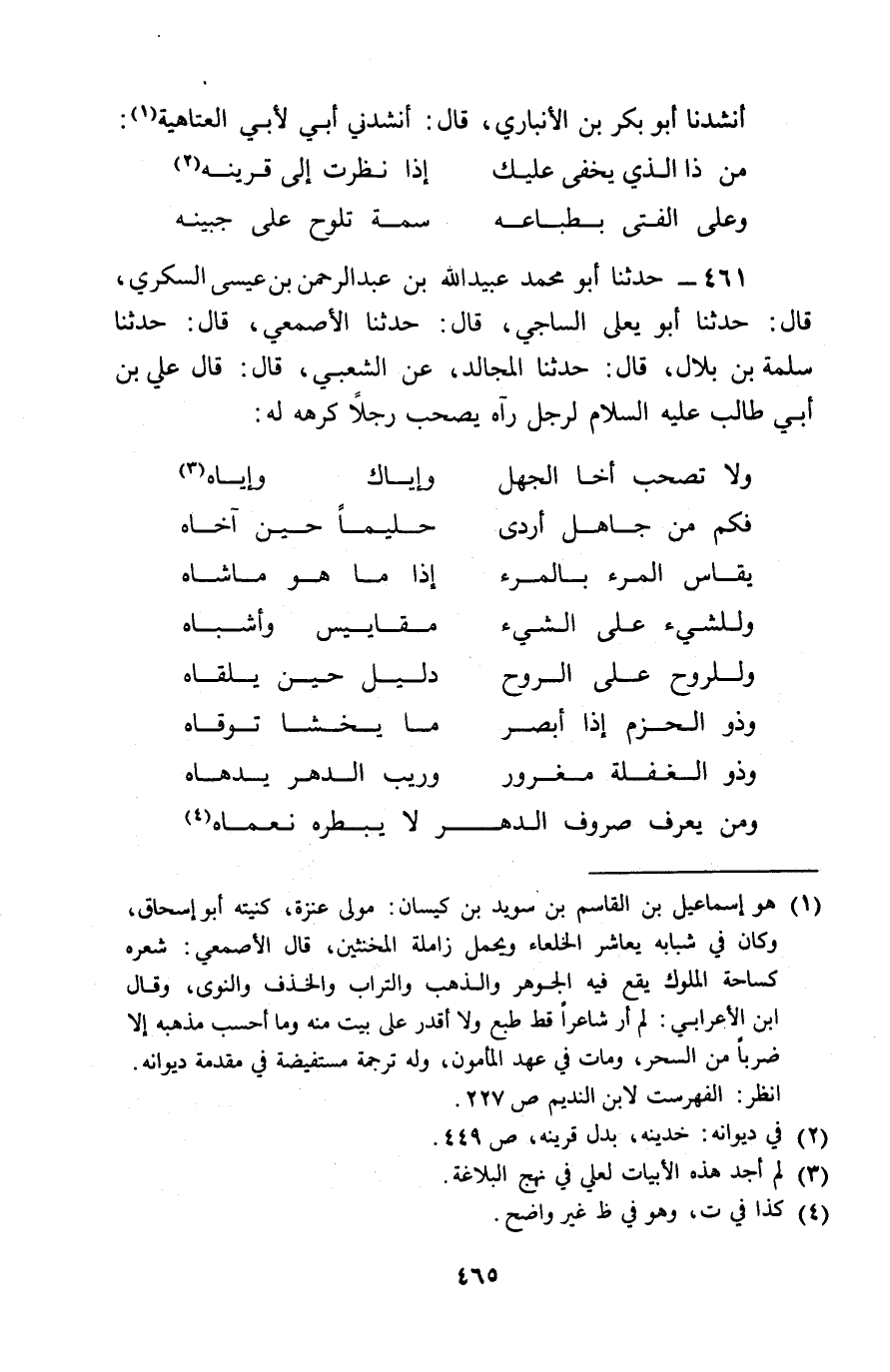461 - حَدَّثَنَا أَبُو مُحَمَّدٍ عُبَيْدُ اللَّهِ بْنُ عَبْدِ الرَّحْمَنِ بْنِ عِيسَى السُّكَّرِيُّ قَالَ: حَدَّثَنَا أَبُو يَعْلَى السَّاجِيُّ , قَالَ: حَدَّثَنَا الْأَصْمَعِيُّ , قَالَ: حَدَّثَنَا سَلَمَةُ بْنُ بِلَالٍ , قَالَ: حَدَّثَنَا الْمُجَالِدُ , عَنِ الشَّعْبِيِّ , قَالَ: قَالَ عَلِيُّ بْنُ أَبِي طَالِبٍ عَلَيْهِ السَّلَامُ لِرَجُلٍ رَآهُ يَصْحَبُ رَجُلًا كَرِهَهُ لَهُ: