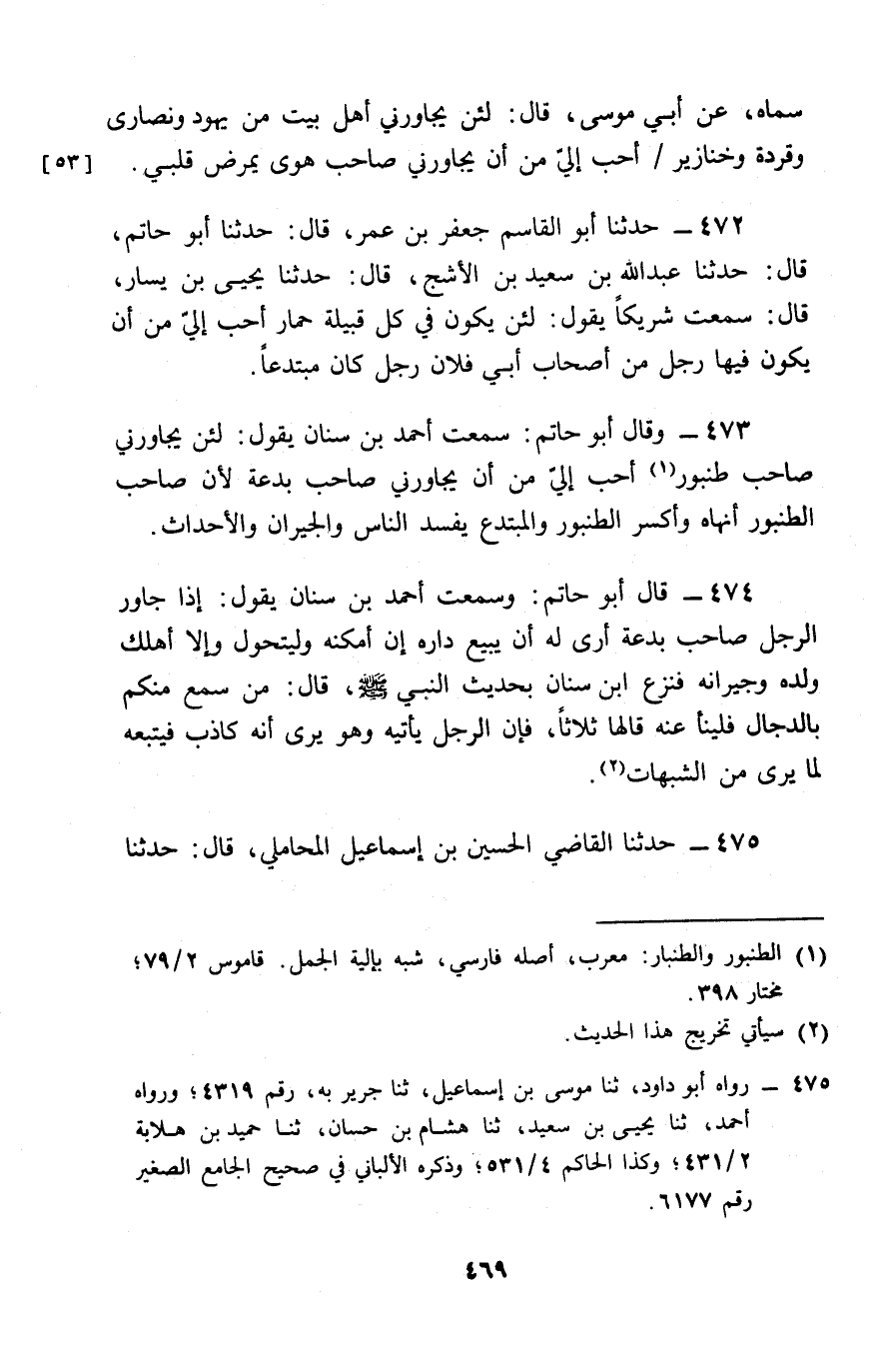 473 - وَقَالَ أَبُو حَاتِمٍ: سَمِعْتُ أَحْمَدَ بْنَ سِنَانٍ , يَقُولُ: §" لَئِنْ يُجَاوِرَنِي صَاحِبُ طُنْبُورٍ , أَحَبُّ إِلَيَّ مِنْ أَنْ يُجَاوِرَنِي صَاحِبُ بِدْعَةٍ , لِأَنَّ صَاحِبَ الطُّنْبُورِ أَنْهَاهُ , وَأَكْسَرُ الطُّنْبُورَ , وَالْمُبْتَدِعُ يُفْسِدُ النَّاسَ , وَالْجِيرَانَ , وَالْأَحْدَاثَ