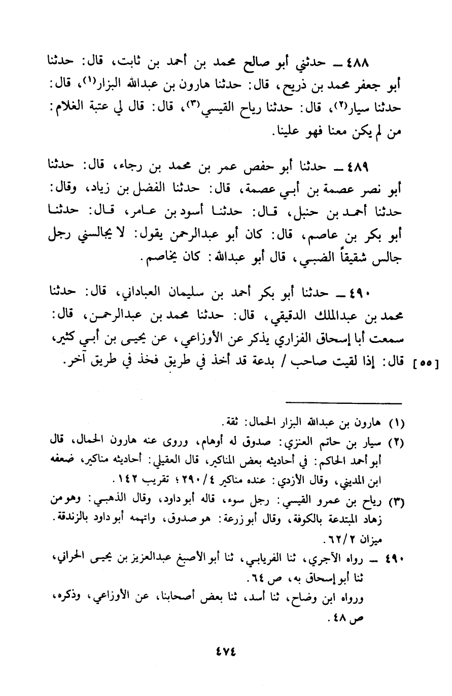489 - حَدَّثَنَا أَبُو حَفْصٍ عُمَرُ بْنُ مُحَمَّدِ بْنِ رَجَاءٍ قَالَ: حَدَّثَنَا أَبُو نَصْرٍ عِصْمَةُ بْنُ أَبِي عِصْمَةَ قَالَ: حَدَّثَنَا الْفَضْلُ بْنُ زِيَادٍ , وَقَالَ: حَدَّثَنَا أَحْمَدُ بْنُ حَنْبَلٍ , قَالَ: حَدَّثَنَا أَسْوَدُ بْنُ عَامِرٍ , قَالَ: حَدَّثَنَا أَبُو بَكْرِ بْنُ عَاصِمٍ , قَالَ: كَانَ أَبُو عَبْدِ الرَّحْمَنِ يَقُولُ: § «لَا يُجَالِسُنِي رَجُلٌ جَالَسَ شَقِيقًا الضَّبِّيَّ» , قَالَ أَبُو عَبْدِ اللَّهِ: كَانَ يُخَاصِمُ