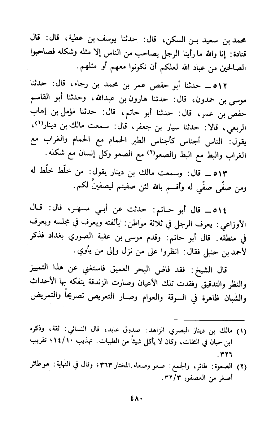 512 - حَدَّثَنَا أَبُو حَفْصٍ عُمَرُ بْنُ مُحَمَّدِ بْنِ رَجَاءٍ قَالَ: حَدَّثَنَا مُوسَى بْنُ حَمْدُونَ , قَالَ: حَدَّثَنَا هَارُونُ بْنُ عَبْدِ اللَّهِ , وَحَدَّثَنَا أَبُو الْقَاسِمِ حَفْصُ بْنُ عُمَرَ قَالَ: حَدَّثَنَا أَبُو حَاتِمٍ , قَالَ: حَدَّثَنَا مُؤَمَّلُ بْنُ إِهَابٍ الرَّبَعِيُّ , قَالَا: حَدَّثَنَا سَيَّارُ بْنُ جَعْفَرٍ , قَالَ: سَمِعْتُ مَالِكَ بْنَ دِينَارٍ , يَقُولُ: § «النَّاسُ أَجْنَاسٌ كَأَجْنَاسِ الطَّيْرِ الْحَمَامُ مَعَ الْحَمَامِ , وَالْغُرَابُ مَعَ الْغُرَابِ , وَالْبَطُّ مَعَ الْبَطِّ , وَالصَّعْوُ مَعَ الصَّعْوِ , وَكُلُّ إِنْسَانٍ مَعَ شِكْلِهِ»