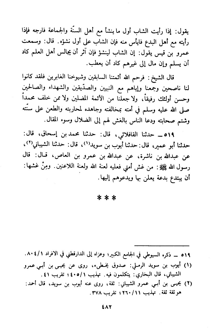 519 - حَدَّثَنَا الْقَافْلَائِيُّ , قَالَ: حَدَّثَنَا مُحَمَّدُ بْنُ إِسْحَاقَ , قَالَ: حَدَّثَنَا أَبُو عُمَيْرٍ , قَالَ: حَدَّثَنَا أَيُّوبُ بْنُ سُوَيْدٍ , قَالَ: حَدَّثَنَا الشَّيْبَانِيُّ , عَنْ عَبْدِ اللَّهِ بْنِ نَاشِرَةَ , عَنْ عَبْدِ اللَّهِ بْنِ عَمْرِو بْنِ الْعَاصِ , قَالَ: قَالَ رَسُولُ اللَّهِ صَلَّى اللَّهُ عَلَيْهِ وَسَلَّمَ: §" مَنْ غَشَّ أُمَّتِي , فَعَلَيْهِ لَعْنَةُ اللَّهِ , وَلَعْنَةُ اللَّاعِنِينَ , وَمِنْ غِشِّهَا: أَنْ يَبْتَدِعَ بِدْعَةً يَعْلَنُ بِهَا , وَيَدْعُوهُمْ إِلَيْهَا "