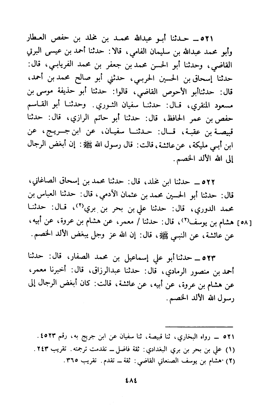 522 - حَدَّثَنَا ابْنُ مَخْلَدٍ , قَالَ: حَدَّثَنَا مُحَمَّدُ بْنُ إِسْحَاقَ الصَّاغَانِيُّ , قَالَ: حَدَّثَنَا أَبُو الْحُسَيْنِ مُحَمَّدُ بْنُ عُثْمَانَ الْآدَمِيُّ قَالَ: حَدَّثَنَا الْعَبَّاسُ بْنُ مُحَمَّدٍ الدُّورِيُّ , قَالَ: حَدَّثَنَا عَلِيُّ بْنُ بَحْرِ بْنِ بَرِّيٍّ , قَالَ: حَدَّثَنَا هِشَامُ بْنُ يُوسُفَ , قَالَ: حَدَّثَنَا مَعْمَرٌ , عَنْ هِشَامِ بْنِ عُرْوَةَ , عَنْ أَبِيهِ , عَنْ عَائِشَةَ، عَنِ النَّبِيِّ صَلَّى اللَّهُ عَلَيْهِ وَسَلَّمَ قَالَ: «إِنَّ §» اللَّهَ عَزَّ وَجَلَّ يَبْغُضُ الْأَلَدَّ الْخَصِمَ "