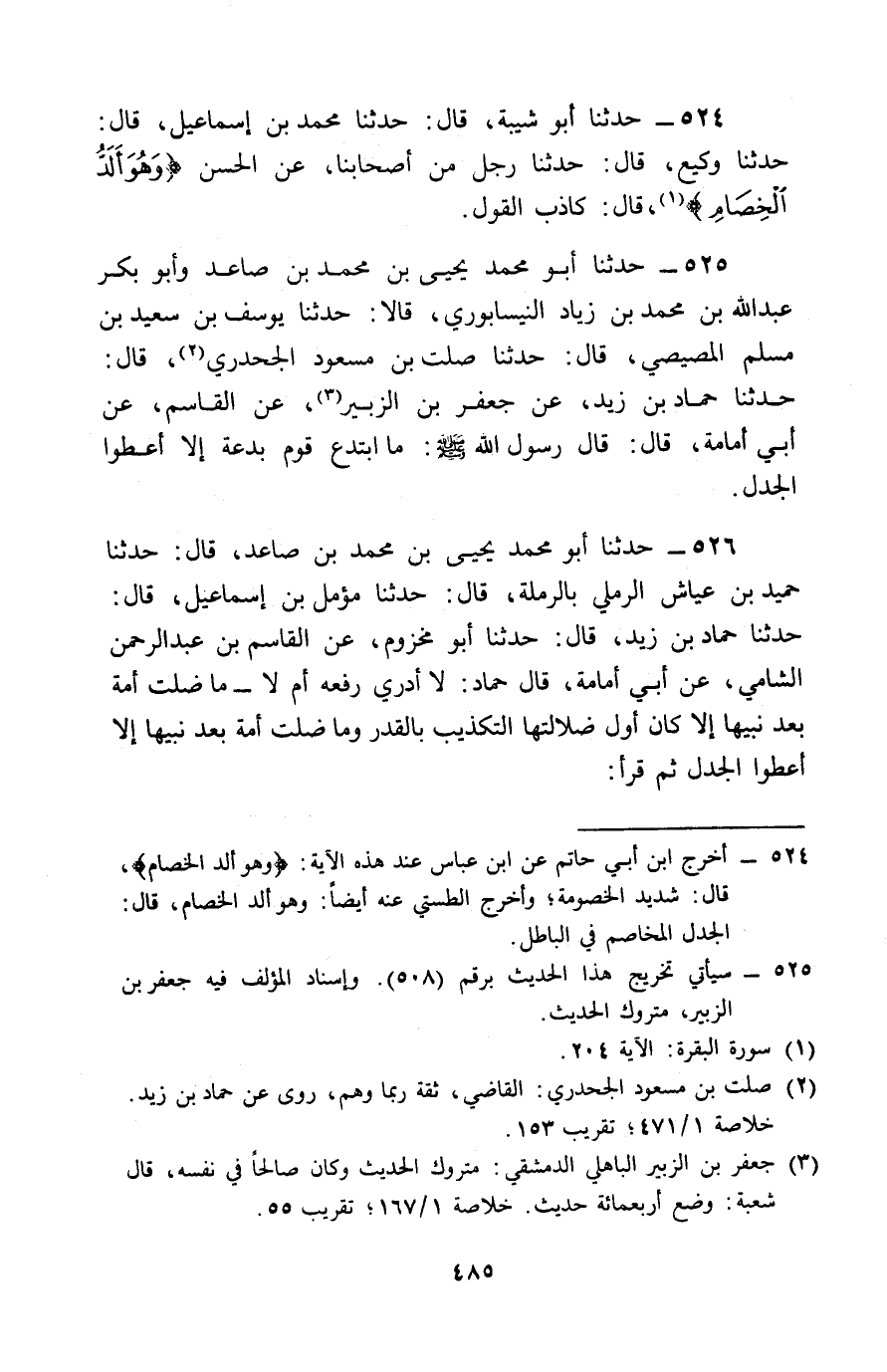 525 - حَدَّثَنَا أَبُو مُحَمَّدٍ يَحْيَى بْنُ مُحَمَّدِ بْنِ صَاعِدٍ , وَأَبُو بَكْرٍ عَبْدُ اللَّهِ بْنُ مُحَمَّدِ بْنِ زِيَادٍ النَّيْسَابُورِيُّ قَالَا: حَدَّثَنَا يُوسُفُ بْنُ سَعِيدِ بْنِ مُسْلِمٍ الْمِصِّيصِيُّ , قَالَ: حَدَّثَنَا صَلْتُ بْنُ مَسْعُودٍ الْجَحْدَرِيُّ , قَالَ: حَدَّثَنَا حَمَّادُ بْنُ زَيْدٍ , عَنْ جَعْفَرِ بْنِ الزُّبَيْرِ , عَنِ الْقَاسِمِ , عَنْ أَبِي أُمَامَةَ , قَالَ: قَالَ رَسُولُ اللَّهِ صَلَّى اللَّهُ عَلَيْهِ وَسَلَّمَ: § «مَا ابْتَدَعَ قَوْمٌ بِدْعَةً , إِلَّا أُعْطُوا الْجَدَلَ»