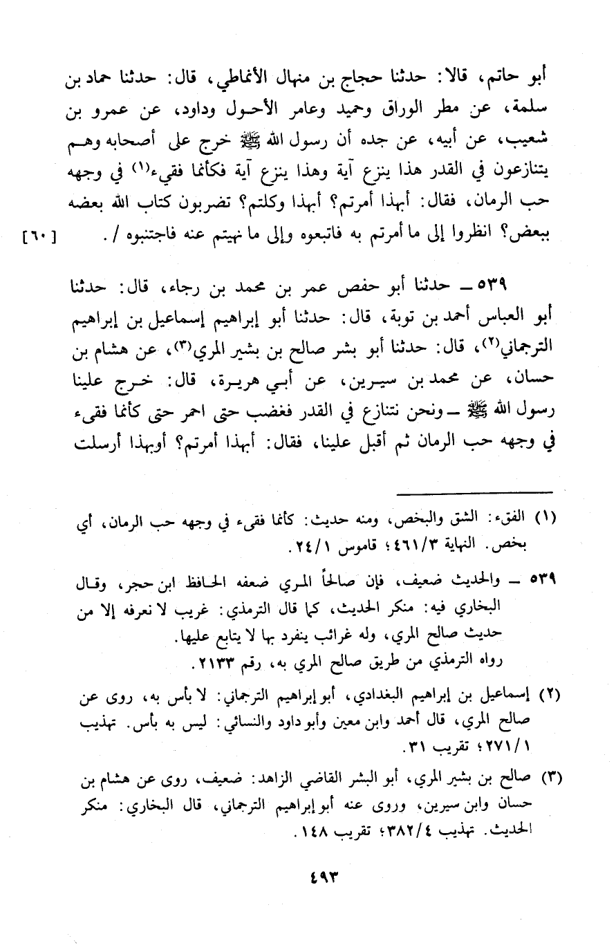 539 - حَدَّثَنَا أَبُو حَفْصٍ عُمَرُ بْنُ مُحَمَّدِ بْنِ رَجَاءٍ قَالَ: حَدَّثَنَا أَبُو الْعَبَّاسِ أَحْمَدُ بْنُ تَوْبَةَ قَالَ: حَدَّثَنَا أَبُو إِبْرَاهِيمَ إِسْمَاعِيلُ بْنُ إِبْرَاهِيمَ التَّرْجُمَانِيُّ قَالَ: حَدَّثَنَا أَبُو بِشْرٍ صَالِحُ بْنُ بَشِيرٍ الْمُرِّيُّ , عَنْ هِشَامِ بْنِ حَسَّانَ , عَنْ مُحَمَّدِ بْنِ سِيرِينَ , عَنْ أَبِي هُرَيْرَةَ , قَالَ: خَرَجَ عَلَيْنَا رَسُولُ اللَّهِ صَلَّى اللَّهُ عَلَيْهِ وَسَلَّمَ , وَنَحْنُ نَتَنَازَعُ فِي الْقَدَرِ , فَغَضِبَ حَتَّى احْمَرَّ , حَتَّى كَأَنَّمَا فُقِئَ فِي وَجْهِهِ حَبُّ الرُّمَّانِ , ثُمَّ أَقْبَلَ عَلَيْنَا , فَقَالَ: § «أَبِهَذَا أُمِرْتُمْ؟ أَوَبِهَذَا أُرْسِلْتُ -[494]- إِلَيْكُمْ؟ إِنَّمَا هَلَكَ مَنْ كَانَ قَبْلَكُمْ حِينَ تَنَازَعُوا فِي هَذَا الْأَمْرِ، عَزَمْتُ عَلَيْكُمْ أَلَّا تَنَازَعُوا فِيهِ»