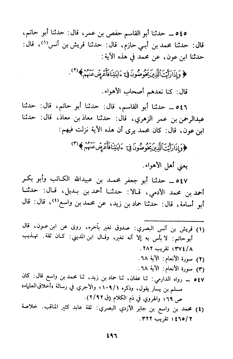 545 - حَدَّثَنَا أَبُو الْقَاسِمِ حَفْصُ بْنُ عُمَرَ قَالَ: حَدَّثَنَا أَبُو حَاتِمٍ , قَالَ: حَدَّثَنَا مُحَمَّدُ بْنُ أَبِي حَازِمٍ , قَالَ: حَدَّثَنَا قُرَيْشُ بْنُ أَنَسٍ , قَالَ: حَدَّثَنَا ابْنُ عَوْنٍ , عَنْ مُحَمَّدٍ , فِي هَذِهِ الْآيَةِ: {§وَإِذَا رَأَيْتَ الَّذِينَ يَخُوضُونَ فِي آيَاتِنَا فَأَعْرِضْ عَنْهُمْ} [الأنعام: 68]. قَالَ: «كُنَّا نَعُدُّهُمْ أَصْحَابَ الْأَهْوَاءِ»