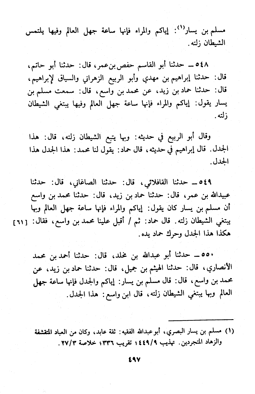 549 - حَدَّثَنَا الْقَافْلَائِيُّ , قَالَ: حَدَّثَنَا الصَّاغَانِيُّ , قَالَ: حَدَّثَنَا عُبَيْدُ اللَّهِ بْنُ عُمَرَ , قَالَ: حَدَّثَنَا حَمَّادُ بْنُ زَيْدٍ , قَالَ: حَدَّثَنَا مُحَمَّدُ بْنُ وَاسِعٍ: أَنَّ مُسْلِمَ بْنَ يَسَارٍ , كَانَ يَقُولُ: § «إِيَّاكُمْ وَالْمِرَاءَ , فَإِنَّهَا سَاعَةُ جَهْلِ الْعَالِمِ , وَبِهَا يَبْتَغِي الشَّيْطَانُ زَلَّتَهُ» قَالَ حَمَّادٌ: ثُمَّ أَقْبَلَ عَلَيْنَا مُحَمَّدُ بْنُ وَاسِعٍ , فَقَالَ: هَكَذَا هَذَا الْجَدَلُ , وَحَرَّكَ حَمَّادٌ يَدَهُ