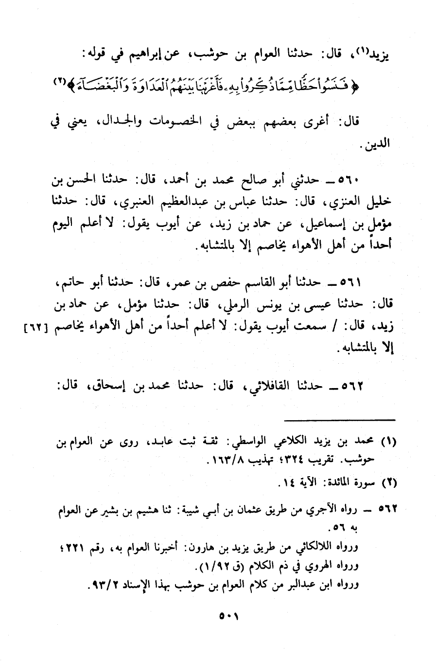 560 - حَدَّثَنِي أَبُو صَالِحٍ مُحَمَّدُ بْنُ أَحْمَدَ قَالَ: حَدَّثَنَا الْحَسَنُ بْنُ خَلِيلٍ الْعَنَزِيُّ , قَالَ: حَدَّثَنَا عَبَّاسُ بْنُ عَبْدِ الْعَظِيمِ الْعَنْبَرِيُّ , قَالَ: حَدَّثَنَا مُؤَمَّلُ بْنُ إِسْمَاعِيلَ , عَنْ حَمَّادِ بْنِ زَيْدٍ , عَنْ أَيُّوبَ , يَقُولُ: § «لَا أَعْلَمُ الْيَوْمَ أَحَدًا مِنْ أَهْلِ الْأَهْوَاءِ يُخَاصِمُ إِلَّا بِالْمُتَشَابِهِ»