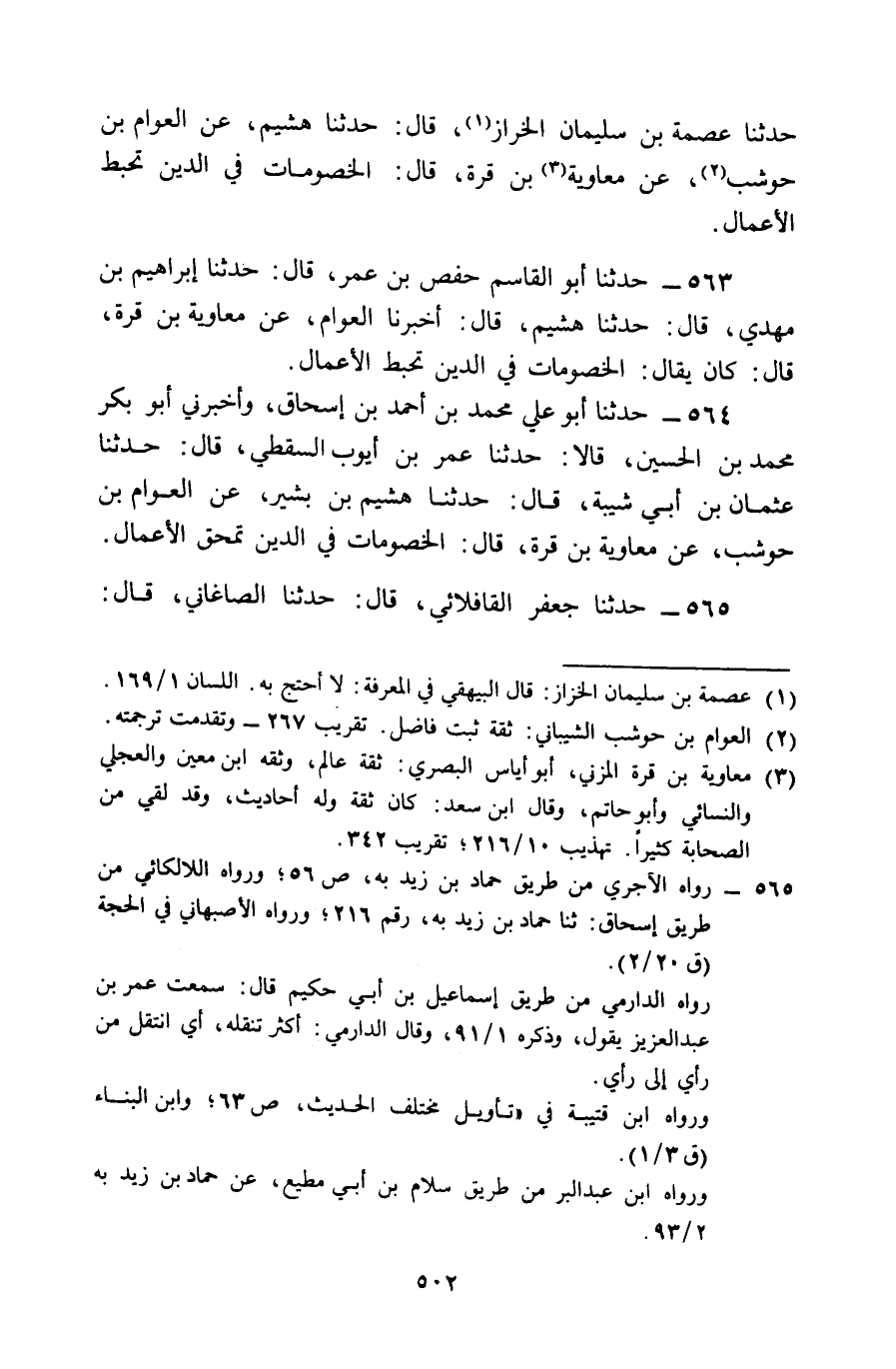564 - حَدَّثَنَا أَبُو عَلِيٍّ مُحَمَّدُ بْنُ أَحْمَدَ بْنِ إِسْحَاقَ , وَأَخْبَرَنِي أَبُو بَكْرٍ مُحَمَّدُ بْنُ الْحُسَيْنِ قَالَا: حَدَّثَنَا عُمَرُ بْنُ أَيُّوبَ السَّقَطِيُّ , قَالَ: حَدَّثَنَا عُثْمَانُ بْنُ أَبِي شَيْبَةَ , قَالَ: حَدَّثَنَا هُشَيْمُ بْنُ بَشِيرٍ , عَنِ الْعَوَّامِ بْنِ حَوْشَبٍ , عَنْ مُعَاوِيَةَ بْنِ قُرَّةَ , قَالَ: § «الْخُصُومَاتُ فِي الدِّينِ تَمْحَقُ الْأَعْمَالَ»