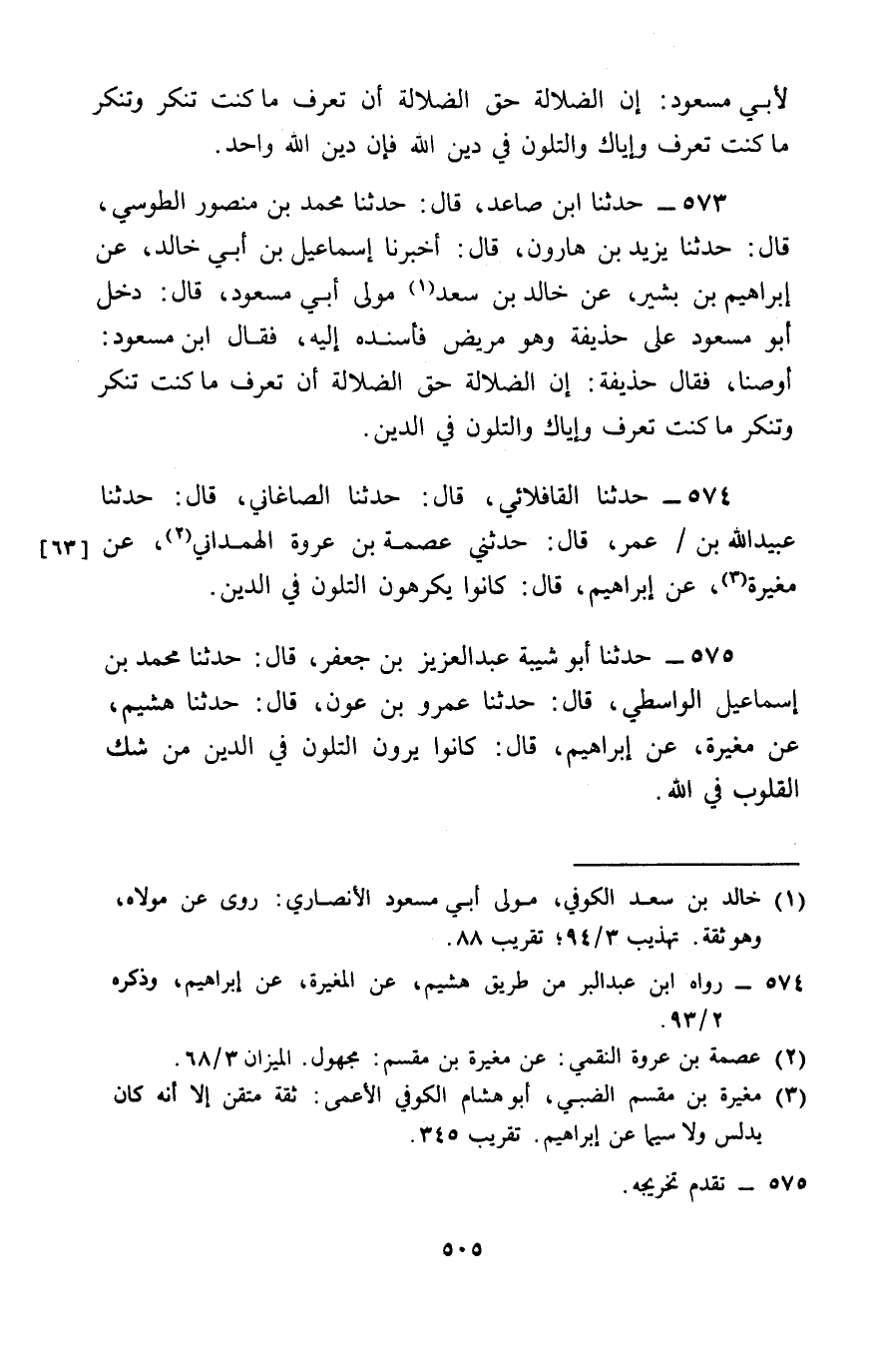 573 - حَدَّثَنَا ابْنُ صَاعِدٍ , قَالَ: حَدَّثَنَا مُحَمَّدُ بْنُ مَنْصُورٍ الطُّوسِيُّ , قَالَ: حَدَّثَنَا يَزِيدُ بْنُ هَارُونَ , قَالَ: أَخْبَرَنَا إِسْمَاعِيلُ بْنُ أَبِي خَالِدٍ , عْنِ إِبْرَاهِيمَ بْنِ بَشِيرٍ , عَنْ خَالِدِ بْنِ سَعْدٍ , مَوْلَى أَبِي مَسْعُودٍ قَالَ: دَخَلَ أَبُو مَسْعُودٍ عَلَى حُذَيْفَةَ وَهُوَ مَرِيضٌ فَأَسْنَدَهُ إِلَيْهِ فَقَالَ ابْنُ مَسْعُودٍ: أَوْصِنَا , فَقَالَ حُذَيْفَةُ: إِنَّ § «الضَّلَالَةَ حَقَّ الضَّلَالَةِ أَنْ تَعْرِفَ مَا كُنْتَ تُنْكِرُ وَتُنْكِرَ مَا كُنْتَ تَعْرِفُ , وَإِيَّاكَ وَالتَّلَوُّنَ فِي الدِّينِ»