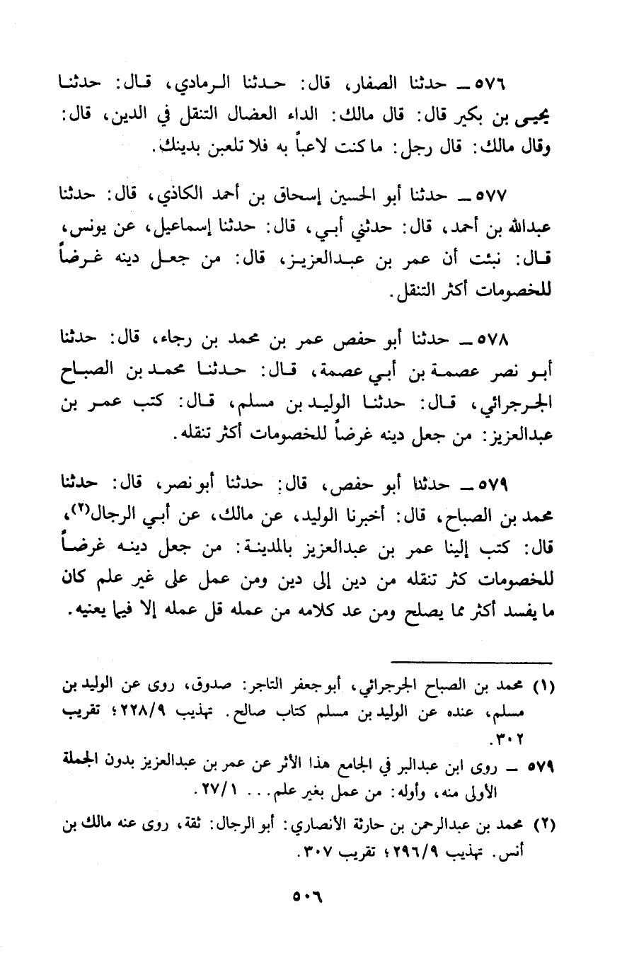 579 - حَدَّثَنَا أَبُو حَفْصٍ , قَالَ: حَدَّثَنَا أَبُو نَصْرٍ , قَالَ: حَدَّثَنَا مُحَمَّدُ بْنُ الصَّبَّاحِ , قَالَ: أَخْبَرَنَا الْوَلِيدُ , عَنْ مَالِكٍ , عَنْ أَبِي الرِّجَالِ , قَالَ: كَتَبَ إِلَيْنَا عُمَرُ بْنُ عَبْدِ الْعَزِيزِ بِالْمَدِينَةِ: § «مَنْ جَعَلَ دِينَهُ غَرَضًا لِلْخُصُومَاتِ كَثُرَ تَنَقُّلُهُ مِنْ دِينٍ إِلَى دِينٍ , وَمَنْ عَمِلَ عَلَى غَيْرِ عِلْمٍ كَانَ مَا يُفْسِدُ أَكْثَرَ مِمَّا يُصْلِحُ , وَمَنْ عَدَّ كَلَامَهُ مِنْ عَمَلِهِ قَلَّ عَمَلُهُ إِلَّا فِيمَا يَعْنِيهِ»