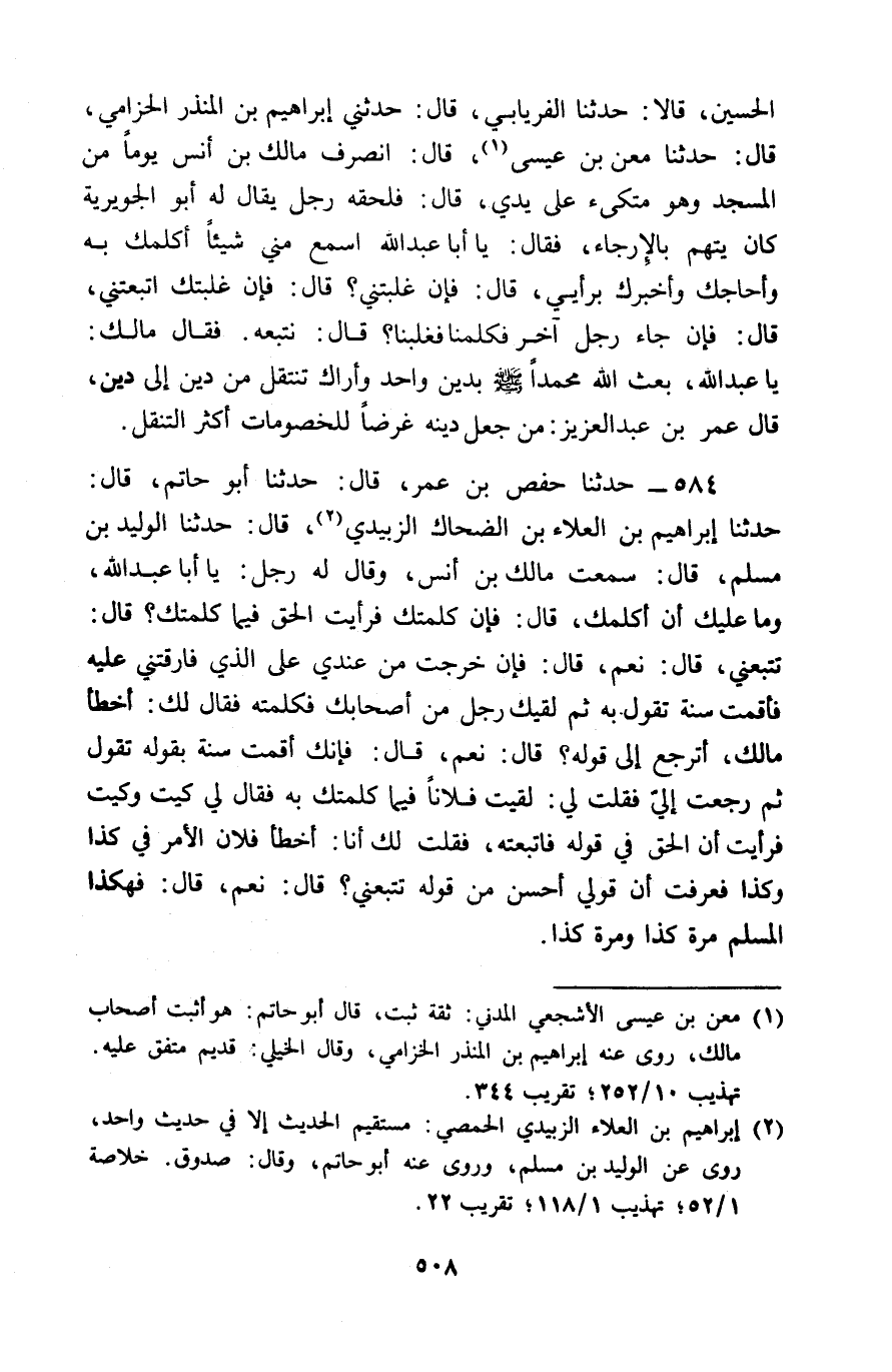 584 - حَدَّثَنَا حَفْصُ بْنُ عُمَرَ , قَالَ: حَدَّثَنَا أَبُو حَاتِمٍ , قَالَ: حَدَّثَنَا إِبْرَاهِيمُ بْنُ الْعَلَاءِ بْنِ الضَّحَّاكِ الزُّبَيْدِيُّ , قَالَ: حَدَّثَنَا الْوَلِيدُ بْنُ مُسْلِمٍ , قَالَ: سَمِعْتُ مَالِكَ بْنَ أَنَسٍ , وَقَالَ , لَهُ رَجُلٌ: يَا أَبَا عَبْدِ اللَّهِ: " §وَمَا عَلَيْكَ أَنْ أُكَلِّمَكَ , قَالَ: فَإِنْ كَلَّمْتُكَ فَرَأَيْتَ الْحَقَّ فِيمَا كَلَّمْتُكَ؟ قَالَ: تَتَّبِعُنِي قَالَ: نَعَمْ قَالَ: فَإِنْ خَرَجْتَ مِنْ عِنْدِي عَلَى الَّذِي فَارَقْتَنِي عَلَيْهِ , فَأَقَمْتَ سَنَةً تَقُولُ بِهِ , ثُمَّ لَقِيَكَ رَجُلٌ مِنْ أَصْحَابِكَ فَكَلَّمْتَهُ , فَقَالَ لَكَ: أَخْطَأَ مَالِكٌ , أَتَرْجِعُ إِلَى قَوْلِهِ؟ قَالَ: نَعَمْ قَالَ: فَإِنَّكَ أَقَمْتَ سَنَةً بِقَوْلِهِ تَقُولُ , ثُمَّ رَجَعْتَ إِلَيَّ , فَقُلْتَ لِي: لَقِيتُ فُلَانًا فِيمَا كَلَّمْتُكَ بِهِ , فَقَالَ لِي: كَيْتَ وَكَيْتَ , فَرَأَيْتُ أَنَّ الْحَقَّ فِي قَوْلِهِ فَاتَّبَعْتُهُ , فَقُلْتُ لَكَ أَنَا: أَخْطَأَ فُلَانٌ الْأَمْرَ فِي كَذَا وَكَذَا , فَعَرَفْتَ أَنَّ قَوْلِي أَحْسَنُ مِنْ قَوْلِهِ تَتَّبِعُنِي؟ قَالَ: نَعَمْ قَالَ: فَهَكَذَا الْمُسْلِمُ مَرَّةً كَذَا , وَمَرَّةً كَذَا