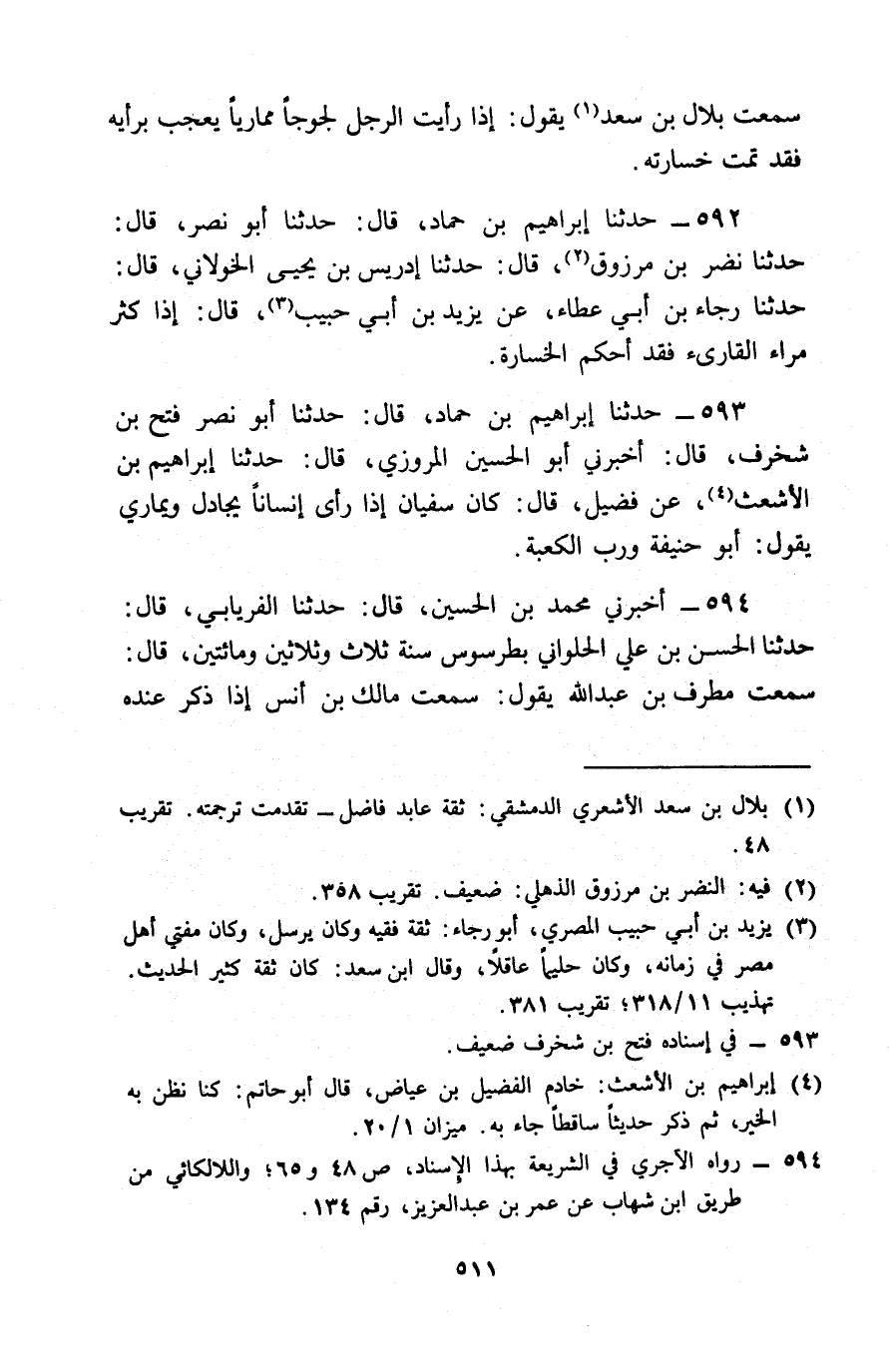 592 - حَدَّثَنَا إِبْرَاهِيمُ بْنُ حَمَّادٍ , قَالَ: حَدَّثَنَا أَبُو نَصْرٍ , قَالَ: حَدَّثَنَا نَضَّرُ بْنُ مَرْزُوقٍ , قَالَ: حَدَّثَنَا إِدْرِيسُ بْنُ يَحْيَى الْخَوْلَانِيُّ , قَالَ: حَدَّثَنَا رَجَاءُ بْنُ أَبِي عَطَاءٍ , عَنْ يَزِيدَ بْنِ أَبِي حَبِيبٍ , قَالَ: § «إِذَا كَثُرَ مِرَاءُ الْقَارِئِ , فَقَدْ أَحْكَمَ الْخَسَارَةَ»