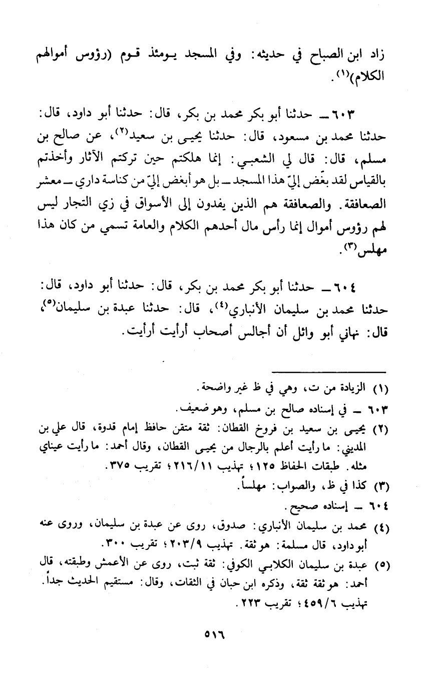 603 - حَدَّثَنَا أَبُو بَكْرٍ مُحَمَّدُ بْنُ بَكْرٍ قَالَ: حَدَّثَنَا أَبُو دَاوُدَ , قَالَ: حَدَّثَنَا مُحَمَّدُ بْنُ مَسْعُودٍ , قَالَ: حَدَّثَنَا يَحْيَى بْنُ سَعِيدٍ , عَنْ صَالِحِ بْنِ مُسْلِمٍ , قَالَ: قَالَ لِي الشَّعْبِيُّ: § «إِنَّمَا هَلَكْتُمْ حِينَ تَرَكْتُمُ الْآثَارَ , وَأَخَذْتُمْ بِالْقِيَاسِ , لَقَدْ بُغِّضَ إِلَيَّ هَذَا الْمَسْجِدُ , بَلْ هُوَ أَبْغَضُ إِلَيَّ مِنْ كُنَاسَةِ دَارِي مَعْشَرَ الصَّعَافِقَةِ , وَالصَّعَافِقَةُ هُمُ الَّذِينَ يَفِدُونَ إِلَى الْأَسْوَاقِ فِي زِيِّ التُّجَّارِ , لَيْسَ لَهُمْ رُءُوسُ أَمْوَالٍ , إِنَّمَا رَأْسُ مَالِ أَحَدِهِمُ الْكَلَامُ , وَالْعَامَّةُ تُسَمِّي مِنْ كَانَ هَذَا مُهَلِّسًا»