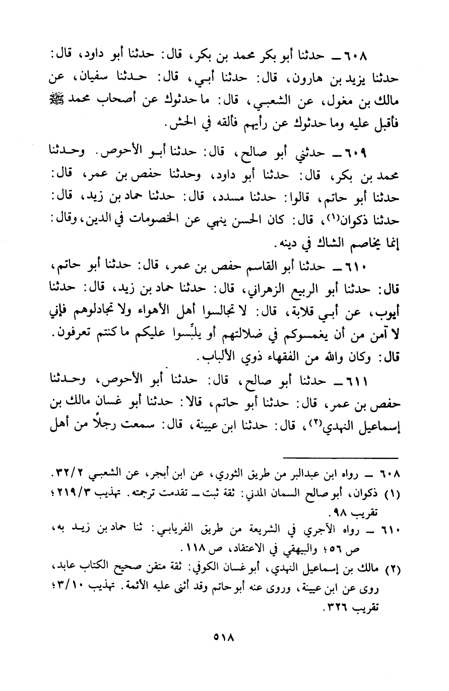 609 - حَدَّثَنِي أَبُو صَالِحٍ , قَالَ: حَدَّثَنَا أَبُو الْأَحْوَصِ , وَحَدَّثَنَا مُحَمَّدُ بْنُ بَكْرٍ , قَالَ: حَدَّثَنَا أَبُو دَاوُدَ , وَحَدَّثَنَا حَفْصُ بْنُ عُمَرَ , قَالَ: حَدَّثَنَا أَبُو حَاتِمٍ , قَالُوا: حَدَّثَنَا مُسَدَّدٌ , قَالَ: حَدَّثَنَا حَمَّادُ بْنُ زَيْدٍ , قَالَ: حَدَّثَنَا ذَكْوَانُ , قَالَ: كَانَ الْحَسَنُ " §يَنْهَى عَنِ الْخُصُومَاتِ فِي الدِّينِ , وَقَالَ: إِنَّمَا يُخَاصِمُ الشَّاكُّ فِي دِينِهِ "