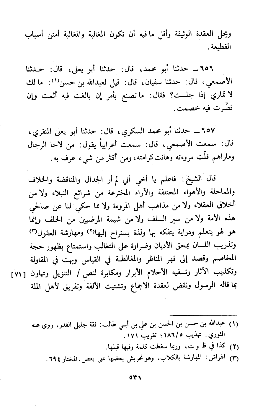 657 - حَدَّثَنَا أَبُو مُحَمَّدٍ السُّكَّرِيُّ , قَالَ: حَدَّثَنَا أَبُو يَعْلَى الْمِنْقَرِيُّ , قَالَ: سَمِعْتُ الْأَصْمَعِيَّ , قَالَ: سَمِعْتُ أَعْرَابِيًّا , يَقُولُ: § «مَنْ لَاحَا الرِّجَالَ , وَمَارَاهُمْ قَلَّتْ مُرُوءَتُهُ , وَهَانَتْ كَرَامَتُهُ , وَمَنْ أَكْثَرَ مِنْ شَيْءٍ عُرِفَ بِهِ» قَالَ الشَّيْخُ: فَاعْلَمْ يَا أَخِي أَنِّي لَمْ أَرَ الْجِدَالَ وَالْمُنَاقَضَةَ , وَالْخِلَافَ , وَالْمُمَاحَلَةَ , وَالْأَهْوَاءَ الْمُخْتَلِفَةَ , وَالْآرَاءَ الْمُخْتَرَعَةَ مِنْ شَرَائِعِ النُّبَلَاءِ , وَلَا مِنْ أَخْلَاقِ الْعُقَلَاءِ , وَلَا مِنْ مَذَاهِبِ أَهْلِ الْمُرُوءَةِ , وَلَا مِمَّا حُكِيَ لَنَا عَنْ صَالِحِي هَذِهِ الْأُمَّةِ , وَلَا مِنْ سِيَرِ السَّلَفِ , وَلَا مِنْ شِيمَةِ الْمَرْضِيِّينَ مِنَ الْخَلَفِ , وَإِنَّمَا هُوَ لَهْوٌ يُتَعَلَّمُ , وَدِرَايَةٌ يُتَفَكَّهُ بِهَا , وَلَذَّةٌ يُسْتَرَاحُ إِلَيْهَا , وَمُهَارَشَةُ الْعُقُولِ , وَتَذْرِيبُ اللِّسَانِ بِمَحْقِ الْأَدْيَانِ , وَضَرَاوَةُ عَلَى التَّغَالُبِ , وَاسْتِمْتَاعٌ بِظُهُورِ حُجَّةِ الْمُخَاصِمِ , وَقَصْدٌ إِلَى قَهْرِ الْمُنَاظِرِ , وَالْمُغَالَطَةِ فِي الْقِيَاسِ , وَبَهْتٌ فِي الْمُقَاوَلَةِ , وَتَكْذِيبُ الْآثَارِ , وَتَسْفِيهُ الْأَحْلَامِ الْأَبْرَارِ , وَمُكَابَرَةٌ لِنَصِّ التَّنْزِيلِ , وَتَهَاوُنٌ بِمَا قَالَهُ الرَّسُولُ , وَنَقْضٌ لِعُقْدَةِ الْإِجْمَاعِ , وَتَشْتِيتُ الْأُلْفَةِ , وَتَفْرِيقٌ لِأَهْلِ الْمِلَّةِ , -[532]- وَشُكُوكٌ تَدْخُلُ عَلَى الْأُمَّةِ , وَضَرَاوَةُ السَّلَاطَةِ , وَتَوْغِيرٌ لِلْقُلُوبِ , وَتَوْلِيدٌ لِلشَّحْنَاءِ فِي النُّفُوسِ عَصَمَنَا اللَّهُ وَإِيَّاكُمْ مِنْ ذَلِكَ , وَأَعَاذَنَا مِنْ مُجَالَسَةِ أَهْلِهِ