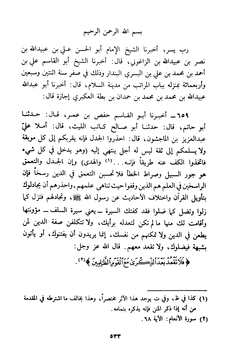 659 - أَخْبَرَنَا الشَّيْخُ الْإِمَامُ أَبُو الْحَسَنِ عَلِيُّ بْنُ عُبَيْدِ اللَّهِ بْنِ نَصْرِ بْنِ عُبَيْدِ اللَّهِ بْنِ الزَّاغُونِيِّ، قَالَ: أَخْبَرَنَا الشَّيْخُ أَبُو الْقَاسِمِ عَلِيُّ بْنُ أَحْمَدَ بْنِ مُحَمَّدِ بْنِ عَلِيِّ بْنِ الْبُسْرِيِّ الْبُنْدَارُ وَذَلِكَ فِي صَفَرٍ سَنَةَ اثْنَتَيْنِ وَسَبْعِينَ وَأَرْبَعِمِائَةٍ بِمَنْزِلِهِ بِبَابِ الْمَرَاتِبِ مِنْ مَدِينَةِ السَّلَامِ قَالَ: أَخْبَرَنَا أَبُو عْبِد اللَّهِ عُبَيْدُ اللَّهِ بْنُ مُحَمَّدِ بْنِ مُحَمَّدِ بْنِ حَمْدَانَ بْنِ بَطَّةَ الْعُكْبَرِيُّ إِجَازَةً قَالَ: أَخْبَرَنَا أَبُو الْقَاسِمِ حَفْصُ بْنُ عُمَرَ قَالَ: حَدَّثَنَا أَبُو حَاتِمٍ , قَالَ: حَدَّثَنَا أَبُو صَالِحٍ كَاتِبُ اللَّيْثِ قَالَ: أَمْلَى عَلَيَّ عَبْدُ الْعَزِيزِ بْنُ الْمَاجِشُونِ قَالَ: §" احْذَرُوا الْجَدَلَ , فَإِنَّهُ يُقَرِّبُكُمْ إِلَى كُلِّ مُوبِقَةٍ , وَلَا يُسَلِّمُكُمْ إِلَى ثِقَةٍ , لَيْسَ لَهُ أَجْلٌ يُنْتَهَى إِلَيْهِ , وَهُوَ يَدْخُلُ فِي كُلِّ شَيْءٍ , فَاتَّخِذُوا الْكَفَّ عَنْهُ طَرِيقًا , فَإِنَّهُ. . . وَالْهُدَى , وَإِنَّ الْجَدَلَ وَالتَّعَمُّقَ هُوَ جَوْرُ السَّبِيلِ , وَصِرَاطُ الْخَطَأِ فَلَا تَحْسَبَنَّ التَّعَمُّقَ فِي الدِّينِ رَسْخًا , فَإِنَّ الرَّاسِخِينَ فِي الْعِلْمِ هُمُ الَّذِينَ وَقَفُوا حَيْثُ تَنَاهَى عِلْمُهُمْ , وَاحْذَرْهُمْ أَنْ يُجَادِلُوكَ بِتَأْوِيلِ الْقُرْآنِ وَاخْتِلَافِ الْأَحَادِيثِ عَنْ رَسُولِ اللَّهِ صَلَّى اللَّهُ عَلَيْهِ وَسَلَّمَ وَتُجَادِلُهُمْ فَتَزِلَّ كَمَا زَلُّوا وَتَضِلُّ كَمَا ضَلُّوا فَقَدْ كَفَتْكَ السِّيرَةُ ـ يَعْنِي سِيرَةَ السَّلَفِ ـ مُؤْنَتَهَا وَأَقَامَتْ لَكَ مِنْهَا مَا لَمْ تَكُنْ لِتَعْدِلَهُ بِرَأْيِكَ , وَلَا تَتَكَلَّفَنَّ صِفَةَ الدِّينِ لِمَنْ يَطْعَنُ فِي الدِّينِ وَلَا تُمَكِّنُهُمْ مِنْ نَفْسِكَ , إِنَّمَا يُرِيدُونَ أَنْ يَفْتِنُوكَ , أَوْ يَأْتُونَ بِشُبْهَةٍ فَيُضِلُّوكَ , وَلَا تَقْعُدْ مَعَهُمْ. قَالَ اللَّهُ عَزَّ وَجَلَّ: {فَلَا تَقْعُدْ بَعْدَ الذِّكْرَى مَعَ الْقَوْمِ الظَّالِمِينَ} [الأنعام: 68]-[534]- وَلَعَمْرِي إِنَّ صِفَةَ الدِّينِ لَبَيِّنَةٌ , وَإِنَّ سُبُلَهُ لَوَاضِحَةٌ , وَإِنَّ مَأْخَذَهُ لَقَرِيبٌ لِمَنْ أَرَادَ اللَّهُ هُدَاهُ , وَلَمْ تَكُنِ الْخُصُومَةُ وَالْجَدَلُ هَوَاهُ , وَلَوْلَا أَنْ يَأْخُذَ الْأَمْرَ مِنْ غَيْرِ مَأْخَذِهِ أَوْ تَتْبَعَ فِيهِ غَيْرَ سَبِيلِ. . . . . . . . . عَوْرَاتُهُمْ لَمَكْشُوفَةٌ , وَإِنَّ حُجَّتَهُمْ لَدَاحِضَةٌ. دَانُوا اللَّهَ بِغَيْرِ دِينٍ وَاحِدٍ بِأَدْيَانٍ شَتَّى يُمْسُونَ عَلَى دِينٍ , وَيُصْبِحُونَ بِهِ كَافِرِينَ "