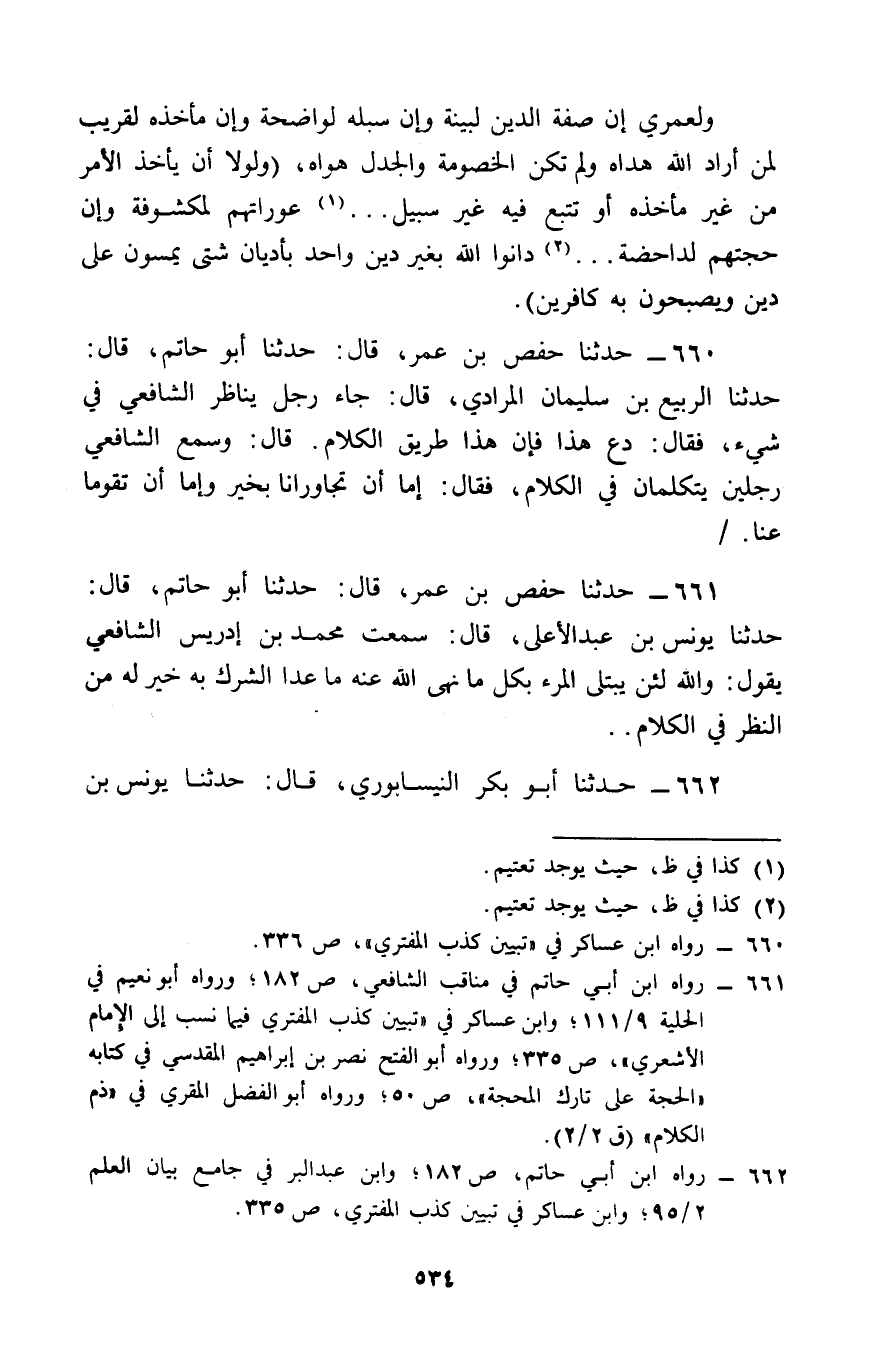 661 - حَدَّثَنَا حَفْصُ بْنُ عُمَرَ , قَالَ: حَدَّثَنَا أَبُو حَاتِمٍ , قَالَ: حَدَّثَنَا يُونُسُ بْنُ عَبْدِ الْأَعْلَى , قَالَ: سَمِعْتُ مُحَمَّدَ بْنَ إِدْرِيسَ الشَّافِعِيَّ , يَقُولُ: وَاللَّهِ § «لَئِنْ يُبْتَلَى الْمَرْءُ بِكُلِّ مَا نَهَى اللَّهُ عَنْهُ , مَاعَدَا الشِّرْكَ بِهِ خَيْرٌ لَهُ مِنَ النَّظَرِ فِي الْكَلَامِ»