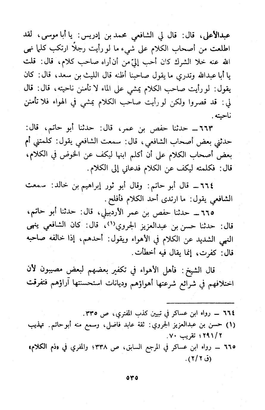665 - حَدَّثَنَا حَفْصُ بْنُ عُمَرَ الْأَرْدُبِيلِيُّ , قَالَ: حَدَّثَنَا أَبُو حَاتِمٍ , قَالَ: حَدَّثَنَا حَسَنُ بْنُ عَبْدِ الْعَزِيزِ الْجَرَوِيُّ , قَالَ: كَانَ الشَّافِعِيُّ " §يَنْهَى النَّهْيَ الشَّدِيدَ عَنِ الْكَلَامِ فِي الْأَهْوَاءِ وَيَقُولُ: أَحَدُهُمْ إِذَا خَالَفَهُ صَاحِبُهُ قَالَ: كَفَرْتَ , إِنَّمَا يُقَالُ فِيهِ: أَخْطَأْتَ قَالَ الشَّيْخُ: فَأَهْلُ الْأَهْوَاءِ فِي تَكْفِيرِ بَعْضِهِمْ لِبَعْضٍ مُصِيبُونَ , لِأَنَّ اخْتِلَافَهُمْ فِي شَرَائِعَ شَرَعَتْهَا أَهْوَاؤُهُمْ , وَدِيَانَاتٍ اسْتَحْسَنَتْهَا آرَاؤُهُمْ , فَتَفَرَّقَتْ -[536]- بِهِمُ الْأَهْوَاءُ، وَشَتَّتْ بِهِمُ الْآرَاءُ , وَحَلَّ بِهِمُ الْبَلَاءُ , وَحُرِمُوا الْبُصَيْرَةَ وَالتَّوْفِيقَ , فَزَلَّتْ أَقْدَامُهُمْ عَنْ مَحَجَّةِ الطَّرِيقِ , فَالْمُخْطِئُ مِنْهُمْ زِنْدِيقٌ , وَالْمُصِيبُ عَلَى غَيْرِ أَصْلٍ وَلَا تَحْقِيقٍ
