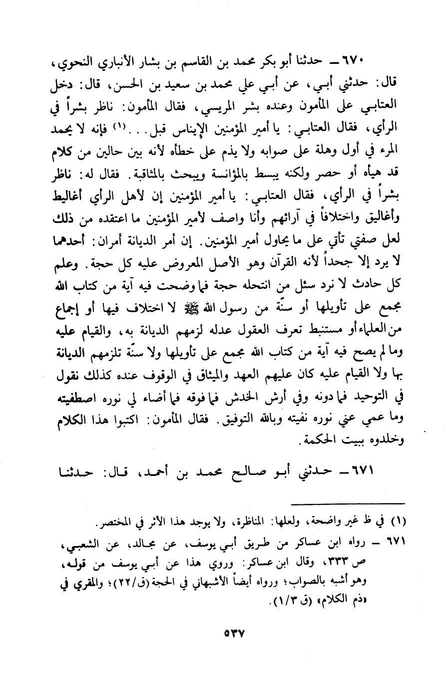 670 - حَدَّثَنَا أَبُو بَكْرٍ مُحَمَّدُ بْنُ الْقَاسِمِ بْنِ بَشَّارٍ الْأَنْبَارِيُّ النَّحْوِيُّ قَالَ: حَدَّثَنِي أَبِي , عَنْ أَبِي عَلِيٍّ مُحَمَّدِ بْنِ سَعِيدِ بْنِ الْحَسَنِ قَالَ: دَخَلَ الْعَتَّابِيُّ عَلَى الْمَأْمُونِ , وَعِنْدَهُ بِشْرٌ الْمِرِّيسِيُّ , فَقَالَ الْمَأْمُونُ: نَاظِرْ بِشْرًا فِي الرَّأْيِ , فَقَالَ الْعَتَّابِيُّ: يَا أَمِيرَ الْمُؤْمِنِينَ §" الْإِينَاسُ قَبْلُ. . . . فَإِنَّهُ لَا يُحْمَدُ الْمَرْءُ فِي أَوَّلِ وَهْلَةٍ عَلَى صَوَابِهِ , وَلَا يُذَمُّ عَلَى خَطَأِهِ , لِأَنَّهُ بَيْنَ حَالَيْنِ مِنْ كَلَامٍ قَدْ هَيَّأَهُ أَوْ حُصِرَ , وَلَكِنَّهُ يَبْسُطُ بِالْمُؤَانَسَةِ , وَيَبْحَثُ بِالْمُثَاقَبَةِ فَقَالَ لَهُ: نَاظِرْ بِشْرًا فِي الرَّأْيِ , فَقَالَ الْعَتَّابِيُّ: يَا أَمِيرَ الْمُؤْمِنِينَ , إِنَّ لِأَهْلِ الرَّأْيِ أَغَالِيطَ وَأَغَالِيقَ وَاخْتِلَافًا فِي آرَائِهِمْ , وَأَنَا وَاصِفٌ لِأَمِيرِ الْمُؤْمِنِينَ مَا اعْتَقَدَهُ مِنْ ذَلِكَ لَعَلَّ صِفَتِي تَأْتِي عَلَى مَا يُحَاوِلُ أَمِيرُ الْمُؤْمِنِينَ. إِنَّ أَمْرَ الدِّيَانَةِ أَمْرَانِ: أَحَدُهُمَا لَا يُرَدُّ إِلَّا جَحْدًا , لِأَنَّهُ الْقُرْآنُ , وَهُوَ الْأَصْلُ الْمَعْرُوضُ عَلَيْهِ كُلُّ حُجَّةٍ. وَعِلْمُ كُلِّ حَادِثٍ لَا نَرُدُّ سُؤْلَ مَنِ انْتَحَلَهُ حُجَّةً , فَمَا وَضَحَتْ فِيهِ آيَةٌ مِنْ كِتَابِ اللَّهِ مُجْمَعٌ عَلَى تَأْوِيلِهَا , أَوْ سُنَّةٌ مِنْ رَسُولِ اللَّهِ صَلَّى اللَّهُ عَلَيْهِ وَسَلَّمَ لَا اخْتِلَافَ فِيهَا , أَوْ إِجْمَاعٌ مِنَ الْعُلَمَاءِ , أَوْ مُسْتَنْبَطٌ تَعْرِفُ الْعُقُولُ عَدْلَهُ لَزِمَهُمُ الدِّيَانَةُ بِهِ , وَالْقِيَامُ عَلَيْهِ , وَمَا لَمْ يَصِحَّ فِيهِ آيَةٌ مِنْ كِتَابِ اللَّهِ مُجْمَعٌ عَلَى تَأْوِيلِهَا , وَلَا سُنَّةٌ تَلْزَمُهُمُ الدِّيَانَةُ بِهَا , وَلَا الْقِيَامُ عَلَيْهِ كَانَ عَلَيْهِمُ الْعَهْدُ وَالْمِيثَاقُ فِي الْوُقُوفِ عِنْدَهُ , كَذَلِكَ نَقُولُ فِي التَّوْحِيدِ , فَمَا دُونَهُ , وَفِي أَرْشِ الْخَدْشِ فَمَا فَوْقَهُ , فَمَا أَضَاءَ لِي نُورُهُ اصْطَفَيْتُهُ , وَمَا عَمِيَ عَنِّي نُورُهُ نَفَيْتُهُ , وَبِاللَّهِ التَّوْفِيقُ. فَقَالَ الْمَأْمُونُ: اكْتُبُوا هَذَا الْكَلَامَ , وَخَلِّدُوهُ بِبَيْتِ الْحِكْمَةِ "