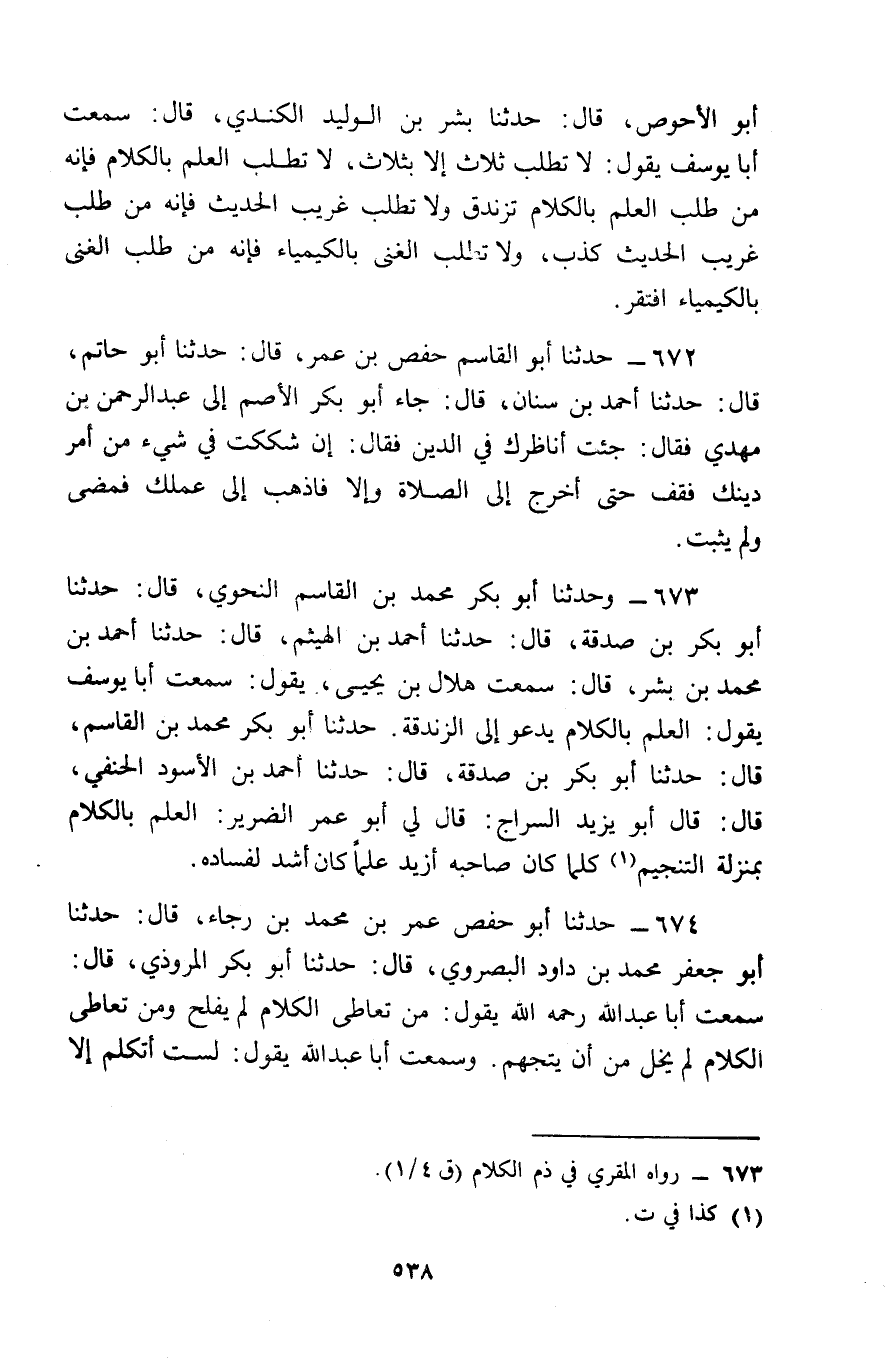 673 - وَحَدَّثَنَا أَبُو بَكْرٍ مُحَمَّدُ بْنُ الْقَاسِمِ النَّحْوِيُّ قَالَ: حَدَّثَنَا أَبُو بَكْرِ بْنُ صَدَقَةَ , قَالَ: حَدَّثَنَا أَحْمَدُ بْنُ الْهَيْثَمِ قَالَ: حَدَّثَنَا أَحْمَدُ بْنُ مُحَمَّدِ بْنِ بِشْرٍ , قَالَ: سَمِعْتُ هِلَالَ بْنَ يَحْيَى , يَقُولُ: سَمِعْتُ أَبَا يُوسُفَ , يَقُولُ: § «الْعِلْمُ بِالْكَلَامِ يَدْعُو إِلَى الزَّنْدَقَةِ»