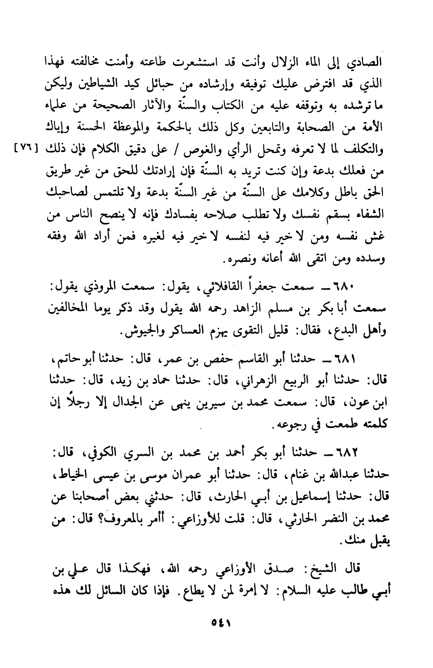 682 - حَدَّثَنَا أَبُو بَكْرٍ أَحْمَدُ بْنُ مُحَمَّدِ بْنِ السَّرِيِّ الْكُوفِيُّ قَالَ: حَدَّثَنَا عَبْدُ اللَّهِ بْنُ غَنَّامٍ , قَالَ: حَدَّثَنَا أَبُو عِمْرَانَ مُوسَى بْنُ عِيسَى الْخَيَّاطُ قَالَ: حَدَّثَنَا إِسْمَاعِيلُ بْنُ أَبِي الْحَارِثِ , قَالَ: حَدَّثَنِي بَعْضُ أَصْحَابِنَا , عَنْ مُحَمَّدِ بْنِ النَّضْرِ الْحَارِثِيِّ , قَالَ: قُلْتُ لِلْأَوْزَاعِيِّ: " §آمُرُ بِالْمَعْرُوفِ؟ قَالَ: مَنْ يَقْبَلُ مِنْكَ قَالَ الشَّيْخُ: صَدَقَ الْأَوْزَاعِيُّ رَحِمَهُ اللَّهُ , فَهَكَذَا قَالَ عَلِيُّ بْنُ أَبِي طَالِبٍ عَلَيْهِ السَّلَامُ: لَا إِمْرَةَ لِمَنْ لَا يُطَاعُ , فَإِذَا كَانَ السَّائِلُ لَكَ هَذِهِ -[542]- أَوْصَافُهُ , وَجَوَابُكَ لَهُ عَلَى النَّحْوِ الَّذِي قَدْ شَرَحْتُهُ , فَشَأْنَكَ بِهِ , وَلَا تَأْلُ فِيهِ جَهْدًا , فَهَذِهِ سَبِيلُ الْعُلَمَاءِ الْمَاضِينَ الَّذِينَ جَعَلَهُمُ اللَّهُ أَعْلَامًا فِي هَذَا الدِّينِ , فَهَذَا أَحَدُ الثَّلَاثَةِ , وَرَجُلٌ آخَرُ يَحْضُرُ فِي مَجْلِسٍ أَنْتَ فِيهِ حَاضِرٌ تَأْمَنُ فِيهِ عَلَى نَفْسِكَ , وَيَكْثُرُ نَاصِرُوكَ وَمُعِينُوكَ , فَيَتَكَلَّمُ بِكَلَامٍ فِيهِ فِتْنَةٌ وَبَلِيَّةٌ عَلَى قُلُوبِ مُسْتَمِعِيهِ لِيُوقِعَ الشَّكَّ فِي الْقُلُوبِ , لِأَنَّهُ هُوَ مِمَّنْ فِي قَلْبِهِ زَيْغٌ يَتْبَعُ الْمُتَشَابِهَ ابْتِغَاءَ الْفِتْنَةِ وَالْبِدْعَةِ , وَقَدْ حَضَرَ مَعَكَ مِنْ إِخْوَانِكَ وَأَهْلِ مَذْهَبِكَ مَنْ يَسْمَعُ كَلَامَهُ , إِلَّا أَنَّهُ لَا حُجَّةَ عِنْدَهُمْ عَلَى مُقَابَلَتِهِ , وَلَا عِلْمَ لَهُمْ بِقَبِيحِ مَا يَأْتِي بِهِ , فَإِنْ سَكَتَّ عَنْهُ لَمْ تَأْمَنْ فِتْنَتَهُ بِأَنْ يُفْسِدَ بِهَا قُلُوبَ الْمُسْتَمِعِينَ , وَإِدْخَالُ الشَّكِّ عَلَى الْمُسْتَبْصِرِينَ , فَهَذَا أَيْضًا مِمَّا تَرُدُّ عَلَيْهِ بِدْعَتَهُ , وَخَبِيثَ مَقَالَتِهِ , وَتَنْشُرُ مَا عَلَّمَكَ اللَّهُ مِنَ الْعِلْمِ وَالْحِكْمَةِ , وَلَا يَكُنْ قَصْدُكَ فِي الْكَلَامِ خُصُومَتَهُ وَلَا مُنَاظَرَتَهُ , وَلْيَكُنْ قَصْدُكَ بِكَلَامِكَ خَلَاصَ إِخْوَانِكَ مِنْ شَبَكَتِهِ , فَإِنَّ خُبَثَاءَ الْمَلَاحِدَةِ إِنَّمَا يَبْسُطُونَ شِبَاكَ الشَّيَاطِينِ لِيَصِيدُوا بِهَا الْمُؤْمِنِينَ , فَلْيَكُنْ إِقْبَالُكَ بِكَلَامِكَ , وَنَشْرِ عِلْمِكَ وَحِكْمَتِكَ , وَبِشْرِ وَجْهِكَ , وَفَصِيحِ مَنْطِقِكَ عَلَى إِخْوَانِكَ , وَمَنْ قَدْ حَضَرَ مَعَكَ لَا عَلَيْهِ , حَتَّى تَقْطَعَ أُولَئِكَ عَنْهُ , وَتَحُولَ بَيْنَهُمْ وَبَيْنَ اسْتِمَاعِ كَلَامِهِ , بَلْ إِنْ قَدَرْتَ أَنْ تَقْطَعَ عَلَيْهِ كَلَامَهُ بِنَوْعٍ مِنَ الْعِلْمِ تُحَوِّلُ بِهِ وُجُوهَ النَّاسِ عَنْهُ , فَافْعَلْ