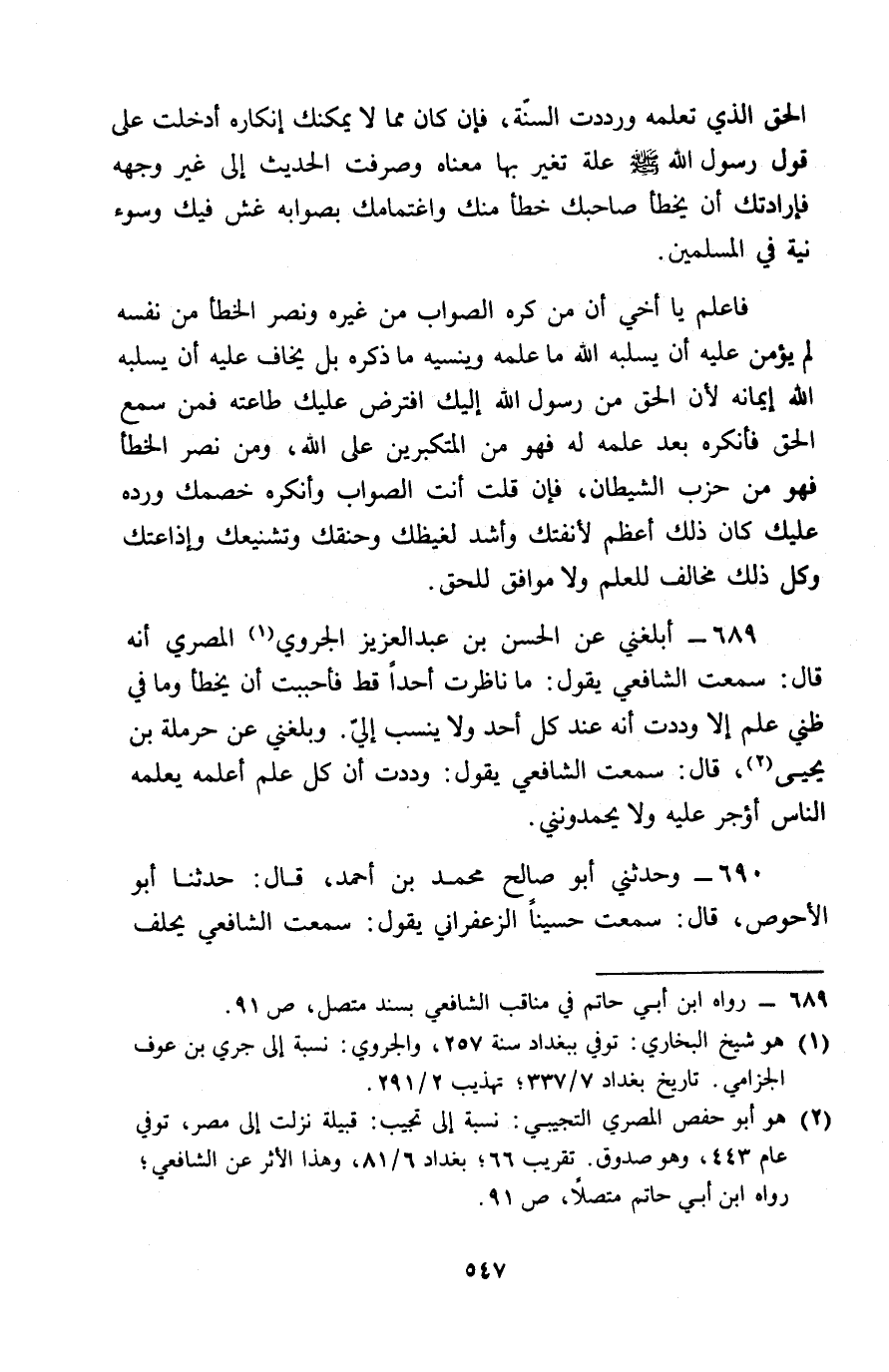 689 - أَبْلَغَنِي عَنِ الْحَسَنِ بْنِ عَبْدِ الْعَزِيزِ الْجَرَوِيِّ الْمِصْرِيِّ , أَنَّهُ قَالَ: سَمِعْتُ الشَّافِعِيَّ , يَقُولُ: § «مَا نَاظَرْتُ أَحَدًا قَطُّ , فَأَحْبَبْتُ أَنْ يَخْطَأَ , وَمَا فِي ظَنِّي عِلْمٌ إِلَّا وَدِدْتُ أَنَّهُ عِنْدَ كُلِّ أَحَدٍ , وَلَا يُنْسَبُ إِلَيَّ»