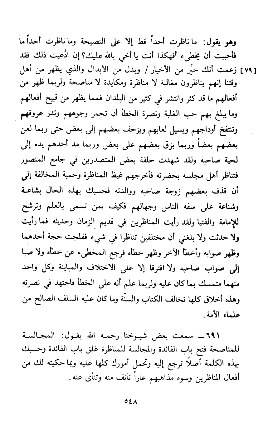 691 - سَمِعْتُ 1131 بَعْضَ , شُيُوخِنَا رَحِمَهُ اللَّهُ يَقُولُ: § «الْمُجَالَسَةُ لِلْمُنَاصَحَةِ فَتْحُ بَابِ الْفَائِدَةِ , وَالْمُجَالَسَةُ لِلْمُنَاظَرَةِ غَلْقُ بَابِ الْفَائِدَةِ , وَحَسْبُكَ بِهَذِهِ الْكَلِمَةِ أَصْلًا تَرْجِعُ إِلَيْهِ , وَتَحْمِلُ أُمُورَكَ كُلَّهَا عَلَيْهِ , وَبِمَا حَكَيْتُهُ لَكَ مِنْ أَفْعَالِ الْمُنَاظِرِينَ , وَسُوءِ مَذَاهِبِهِمْ عَارًا تَأْنَفُ مِنْهُ , وَتَنْأَى عَنْهُ»