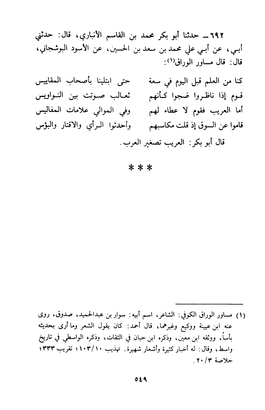 692 - حَدَّثَنَا أَبُو بَكْرٍ مُحَمَّدُ بْنُ الْقَاسِمِ الْأَنْبَارِيُّ قَالَ: حَدَّثَنِي أَبِي , عَنْ أَبِي عَلِيٍّ مُحَمَّدِ بْنِ سَعْدِ بْنِ الْحُسَيْنِ , عَنِ الْأَسْوَدِ الْبُوشَجَانِيُّ , قَالَ: قَالَ مُسَاوِرٌ الْوَرَّاقُ: «