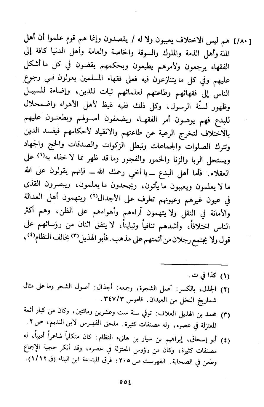 هُمْ لَيْسَ الِاخْتِلَافُ يَعِيبُونَ , وَلَا لَهُ يَقْصِدُونَ , وَإِنَّمَا هُمْ قَوْمٌ عَلِمُوا أَنَّ أَهْلَ الْمِلَّةِ وَأَهْلَ الذِّمَّةِ وَالْمُلُوكَ وَالسُّوقَةَ وَالْخَاصَّةَ وَالْعَامَّةَ وَأَهْلَ الدُّنْيَا كَافَّةً إِلَى الْفُقَهَاءِ يَرْجِعُونَ , وَلِأَمْرِهِمْ يُطِيعُونَ , وَبِحُكْمِهِمْ يَقْضُونَ فِي كُلِّ مَا أُشْكِلَ عَلَيْهِمْ , وَفِي كُلِّ مَا يَتَنَازَعُونَ فِيهِ , فَعَلَى فُقَهَاءِ الْمُسْلِمِينَ يَعُولُونَ فِي رُجُوعِ النَّاسِ إِلَى فُقَهَائِهِمْ , وَطَاعَتُهُمْ لِعُلَمَائِهِمْ ثَبَاتٌ لِلدِّينِ , وَإِضَاءَةٌ لِلسَّبِيلِ , وَظُهُورٌ لِسُنَّةِ الرَّسُولِ , وَكُلُّ ذَلِكَ , فَفِيهِ غَيْظٌ لِأَهْلِ الْأَهْوَاءِ , وَاضْمِحْلَالٌ لِلْبِدَعِ , فَهُمْ يُوهُونَ أَمْرَ الْفُقَهَاءِ , وَيُضَعِّفُونَ أُصُولَهُمْ , وَيَطْعَنُونَ عَلَيْهِمْ بِالِاخْتِلَافِ لِتَخْرُجَ الرَّعِيَّةُ عَنْ طَاعَتِهِمْ , وَالِانْقِيَادِ لِأَحْكَامِهِمْ , فَيُفْسَدُ الدِّينُ , وَتُتْرَكُ الصَّلَوَاتُ وَالْجَمَاعَاتُ , وَتُبْطَلُ الزَّكَوَاتُ وَالصَّدَقَاتُ وَالْحَجُّ وَالْجِهَادُ , وَيُسْتَحَلُّ الرِّبَا وَالزِّنَا وَالْخُمُورُ وَالْفُجُورُ , وَمَا قَدْ ظَهَرَ مِمَّا لَا خِفَاءَ بِهِ عَلَى الْعُقَلَاءِ. فَأَمَّا أَهْلُ الْبِدَعِ يَا أَخِي رَحِمَكَ اللَّهُ فَإِنَّهُمْ يَقُولُونَ عَلَى اللَّهِ مَا لَا يَعْلَمُونَ , وَيَعِيبُونَ مَا يَأْتُونَ , وَيَجْحَدُونَ مَا يَعْلَمُونَ , وَيُبْصِرُونَ الْقَذَى فِي عُيُونِ غَيْرِهِمْ , وَعُيُونُهُمْ تَطْرِفُ عَلَى الْأَجْذَالِ , وَيَتَّهِمُونَ أَهْلَ الْعَدَالَةِ وَالْأَمَانَةِ فِي النَّقْلِ , وَلَا يَتَّهِمُونَ آرَاءَهُمْ وَأَهْوَاءَهُمْ عَلَى الظَّنِّ , وَهُمْ أَكْثَرُ النَّاسِ اخْتِلَافًا , وَأَشَدُّهُمْ تَنَافِيًا وَتَبَايُنًا , لَا يَتَّفِقُ اثْنَانِ مِنْ رُؤَسَائِهِمْ عَلَى قَوْلٍ , وَلَا يَجْتَمِعُ رَجُلَانِ مِنْ أَئِمَّتِهِمْ عَلَى مَذْهَبٍ. فَأَبُو الْهُذَيْلِ يُخَالِفُ النَّظَّامَ ,