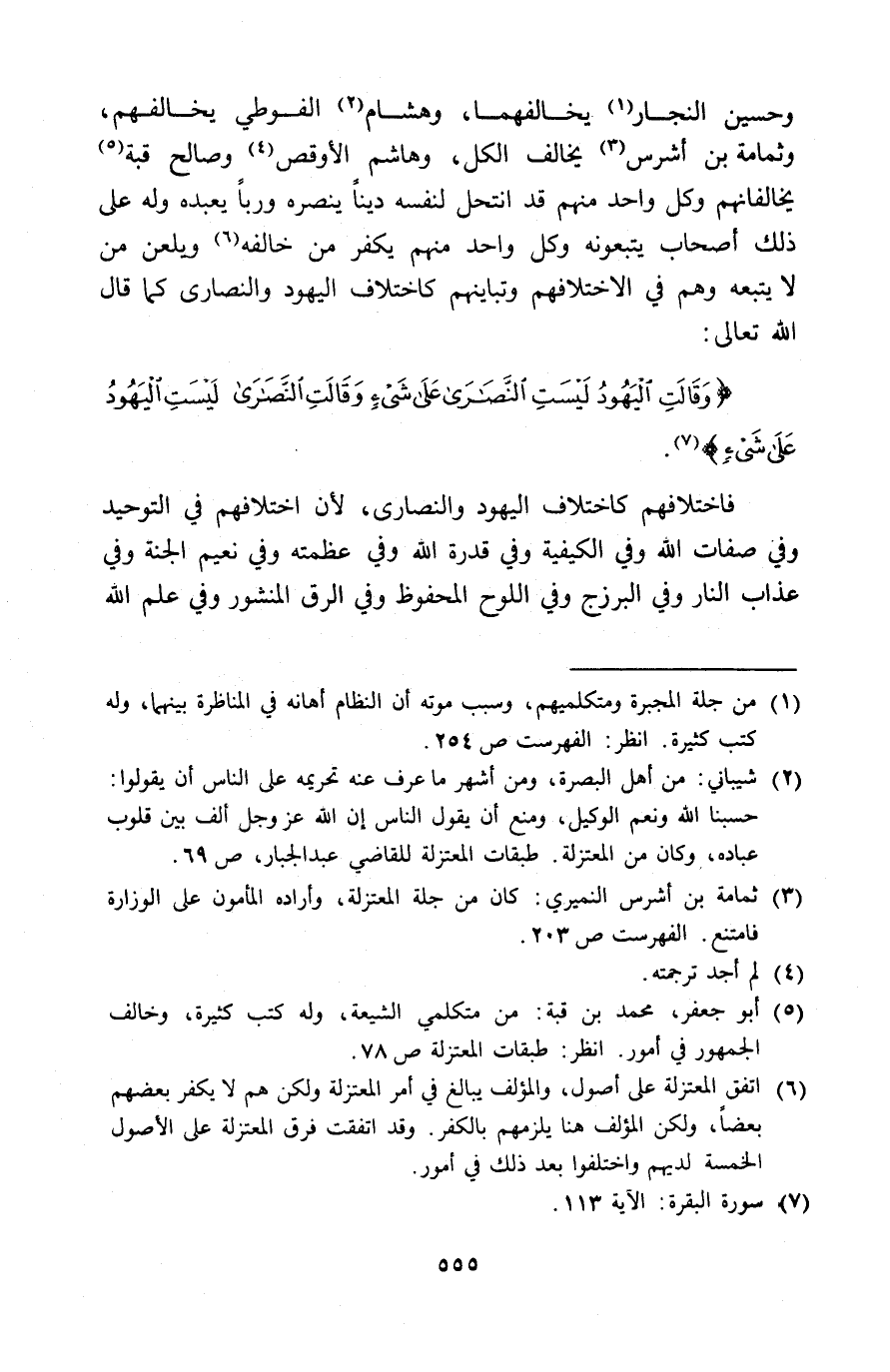 وَحُسَيْنٌ النَّجَّارُ يُخَالِفُهُمَا , وَهِشَامٌ الْفُوَطِيُّ يُخَالِفُهُمْ , وَثُمَامَةُ بْنُ أَشْرَسَ يُخَالِفُ الْكُلَّ , وَهَاشِمٌ الْأَوْقَصُ وَصَالِحُ بْنُ قُبَّةَ يُخَالِفَانِهِمْ , وَكُلُّ وَاحِدٍ مِنْهُمْ قَدِ انْتَحَلَ لِنَفْسِهِ دِينًا يَنْصُرُهُ , وَرَبًّا يَعْبُدُهُ , وَلَهُ عَلَى ذَلِكَ أَصْحَابٌ يَتْبَعُونَهُ , وَكُلُّ وَاحِدٍ مِنْهُمْ يُكَفِّرُ مَنْ خَالَفَهُ , وَيَلْعَنُ مَنْ لَا يَتْبَعُهُ , وَهُمْ فِي اخْتِلَافِهِمْ وَتَبَايُنِهِمْ كَاخْتِلَافِ الْيَهُودِ وَالنَّصَارَى , كَمَا قَالَ اللَّهُ تَعَالَى: {وَقَالَتِ الْيَهُودُ لَيْسَتِ النَّصَارَى عَلَى شَيْءٍ وَقَالَتِ النَّصَارَى لَيْسَتِ الْيَهُودُ عَلَى شَيْءٍ} [البقرة: 113]. فَاخْتِلَافُهُمْ كَاخْتِلَافِ الْيَهُودِ وَالنَّصَارَى , لِأَنَّ اخْتِلَافَهُمْ فِي التَّوْحِيدِ , وَفِي صِفَاتِ اللَّهِ , وَفِي الْكَيْفِيَّةِ , وَفِي قُدْرَةِ اللَّهِ , وَفِي عَظَمَتِهِ , وَفِي نَعِيمِ الْجَنَّةِ , وَفِي عَذَابِ النَّارِ , وَفِي الْبَرْزَخِ , وَفِي اللَّوْحِ الْمَحْفُوظِ , وَفِي الرَّقِّ الْمَنْشُورِ , وَفِي عِلْمِ اللَّهِ ,