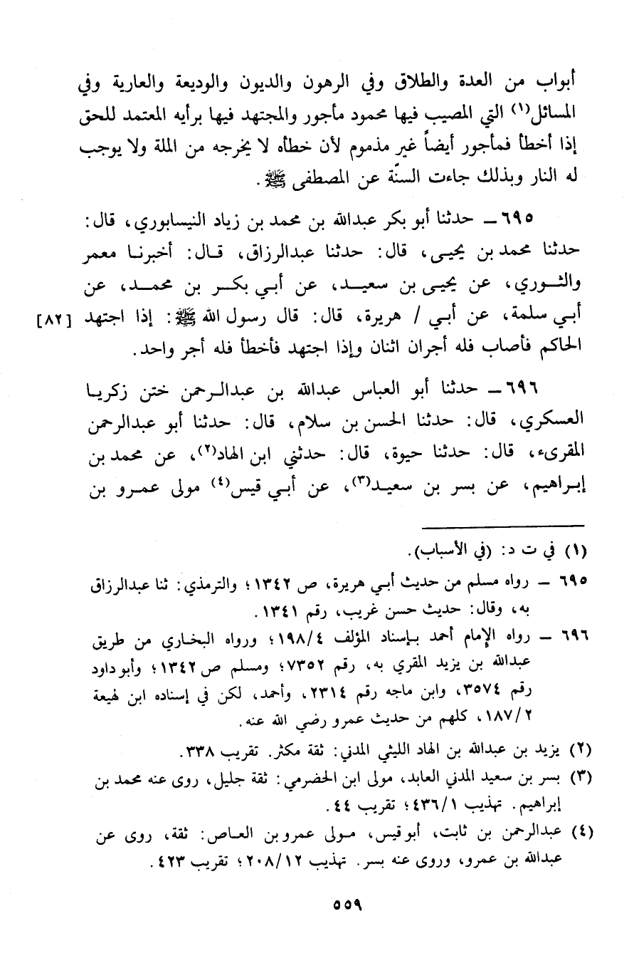 695 - حَدَّثَنَا أَبُو بَكْرٍ عَبْدُ اللَّهِ بْنُ مُحَمَّدِ بْنِ زِيَادٍ النَّيْسَابُورِيُّ , قَالَ: حَدَّثَنَا مُحَمَّدُ بْنُ يَحْيَى , قَالَ: حَدَّثَنَا عَبْدُ الرَّزَّاقِ , قَالَ: أَخْبَرَنَا مَعْمَرٌ , وَالثَّوْرِيُّ , عَنْ يَحْيَى بْنِ سَعِيدٍ , عَنْ أَبِي بَكْرِ بْنِ مُحَمَّدٍ , عَنْ أَبِي سَلَمَةَ , عَنْ أَبِي هُرَيْرَةَ , قَالَ: قَالَ رَسُولُ اللَّهِ صَلَّى اللَّهُ عَلَيْهِ وَسَلَّمَ: § «إِذَا اجْتَهَدَ الْحَاكِمُ فَأَصَابَ فَلَهُ أَجْرَانِ اثْنَانِ , وَإِذَا اجْتَهَدَ فَأَخْطَأَ فَلَهُ أَجْرٌ وَاحِدٌ»