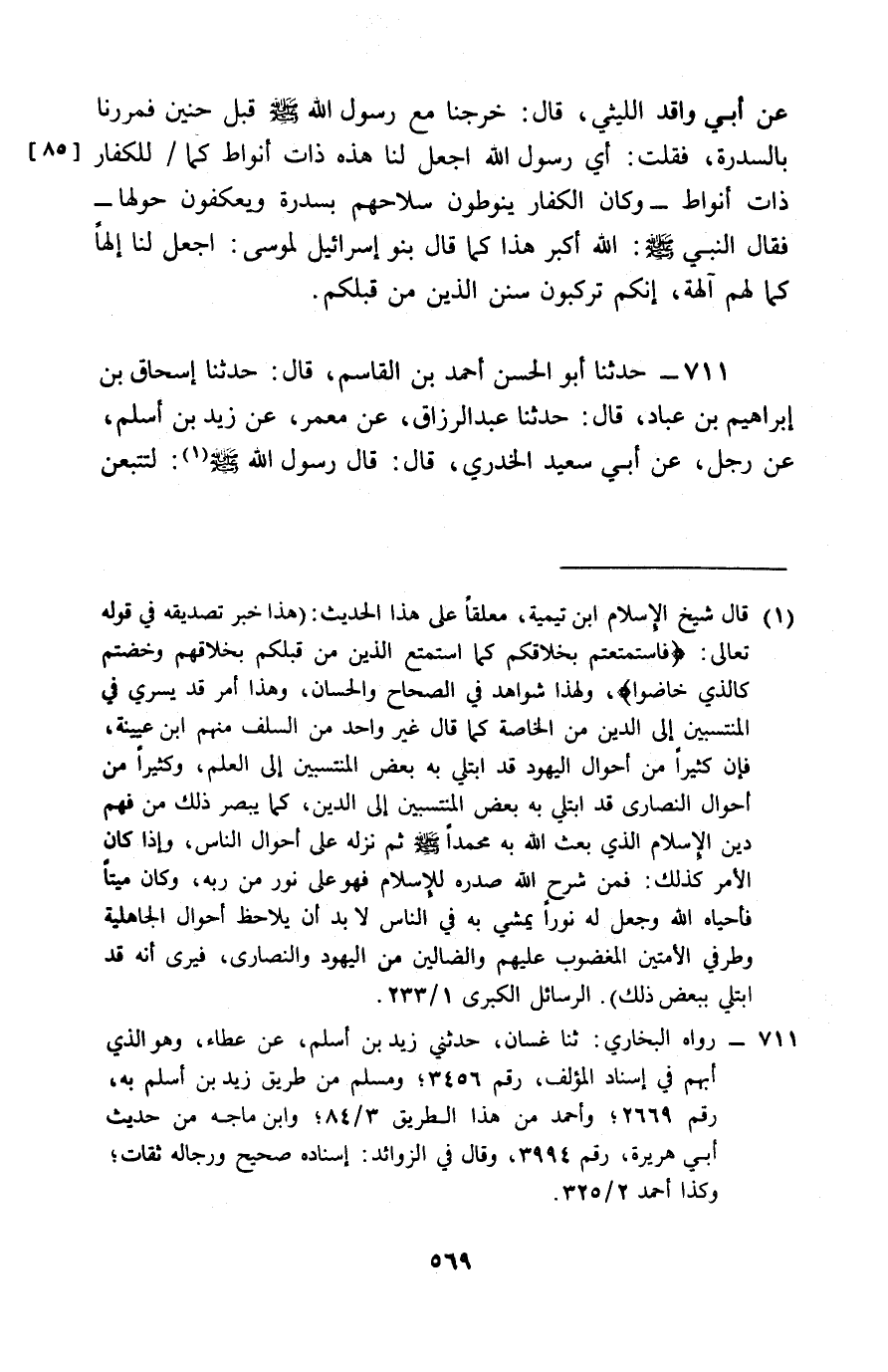 711 - حَدَّثَنَا أَبُو الْحَسَنِ أَحْمَدُ بْنُ الْقَاسِمِ قَالَ: حَدَّثَنَا إِسْحَاقُ بْنُ إِبْرَاهِيمَ بْنِ عَبَّادٍ , قَالَ: حَدَّثَنَا عَبْدُ الرَّزَّاقِ , عَنْ مَعْمَرٍ , عَنْ زَيْدِ بْنِ أَسْلَمَ , عَنْ رَجُلٍ , عَنْ أَبِي سَعِيدٍ الْخُدْرِيِّ , قَالَ: قَالَ رَسُولُ اللَّهِ صَلَّى اللَّهُ عَلَيْهِ وَسَلَّمَ: § «لَتَتَّبِعُنَّ -[570]- سُنَنَ بَنِي إِسْرَائِيلَ شِبْرًا بِشِبْرٍ , وَذِرَاعًا بِذِرَاعٍ , حَتَّى لَوْ كَانَ رَجُلٌ مِنْ بَنِي إِسْرَائِيلَ دَخَلَ جُحْرَ ضَبٍّ لَتَبِعْتُمُوهُ»