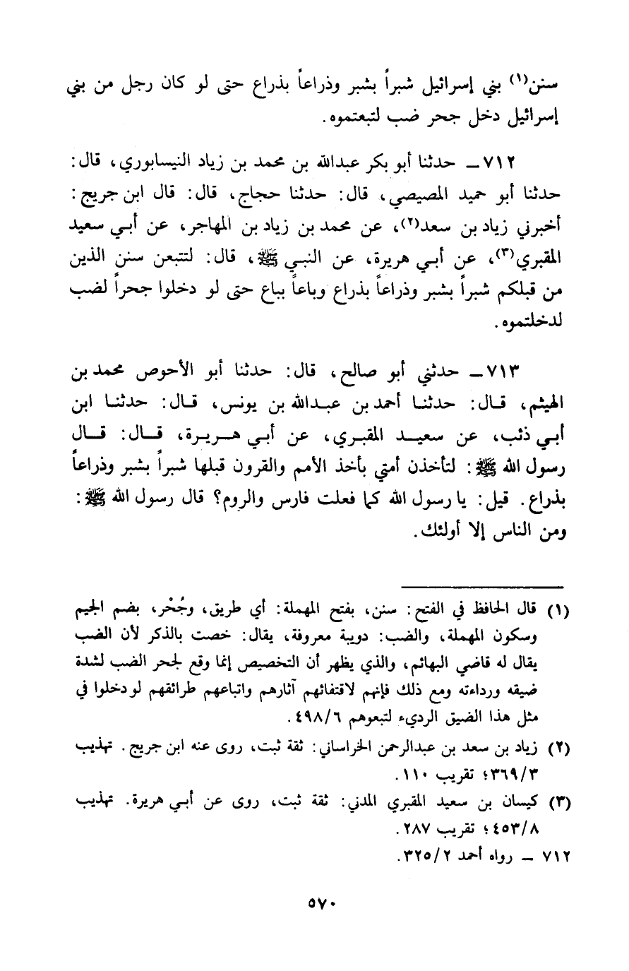 712 - حَدَّثَنَا أَبُو بَكْرٍ عَبْدُ اللَّهِ بْنُ مُحَمَّدِ بْنِ زِيَادٍ النَّيْسَابُورِيُّ , قَالَ: حَدَّثَنَا أَبُو حُمَيْدٍ الْمِصِّيصِيُّ , قَالَ: حَدَّثَنَا حَجَّاجٌ , قَالَ: قَالَ ابْنُ جُرَيْجٍ , أَخْبَرَنِي زِيَادُ بْنُ سَعْدٍ , عَنْ مُحَمَّدِ بْنِ زِيَادِ بْنِ الْمُهَاجِرِ , عَنْ أَبِي سَعِيدٍ الْمَقْبُرِيِّ , عَنْ أَبِي هُرَيْرَةَ , عَنِ النَّبِيِّ صَلَّى اللَّهُ عَلَيْهِ وَسَلَّمَ قَالَ: § «لَتَتَّبِعُنَّ سُنَنَ الَّذِينَ مِنْ قَبْلِكُمْ شِبْرًا بِشِبْرٍ , وَذِرَاعًا بِذِرَاعٍ , وَبَاعًا بِبَاعٍ , حَتَّى لَوْ دَخَلُوا جُحْرًا لِضَّبٍّ لَدَخَلْتُمُوهُ»